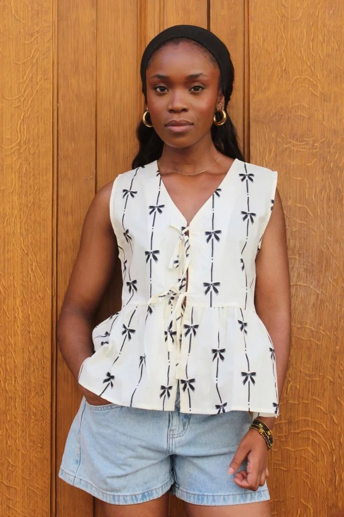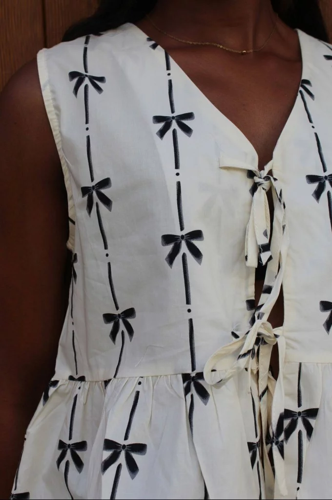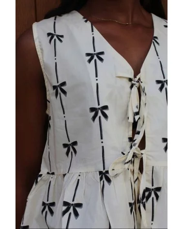 Avec son imprimé noir et blanc en motif nœud et ses nœuds placés au centre pour le fermer, il attire l’œil tout en gardant une allure naturelle et féminine. Sa coupe courte et ajustée sublime la silhouette et met en valeur le décolleté sans jamais trop en faire.