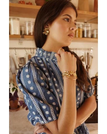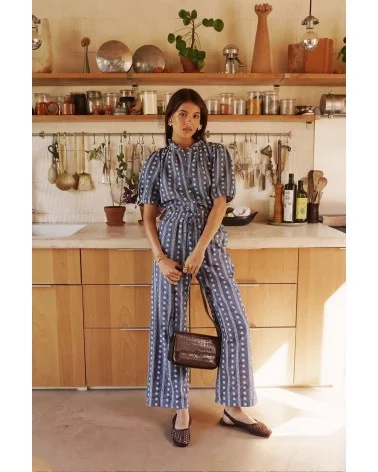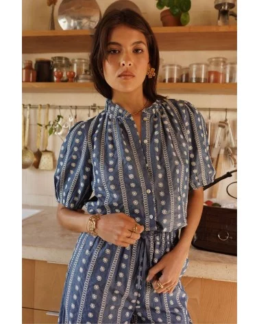 - Blouse courte bleue à motifs blancs
