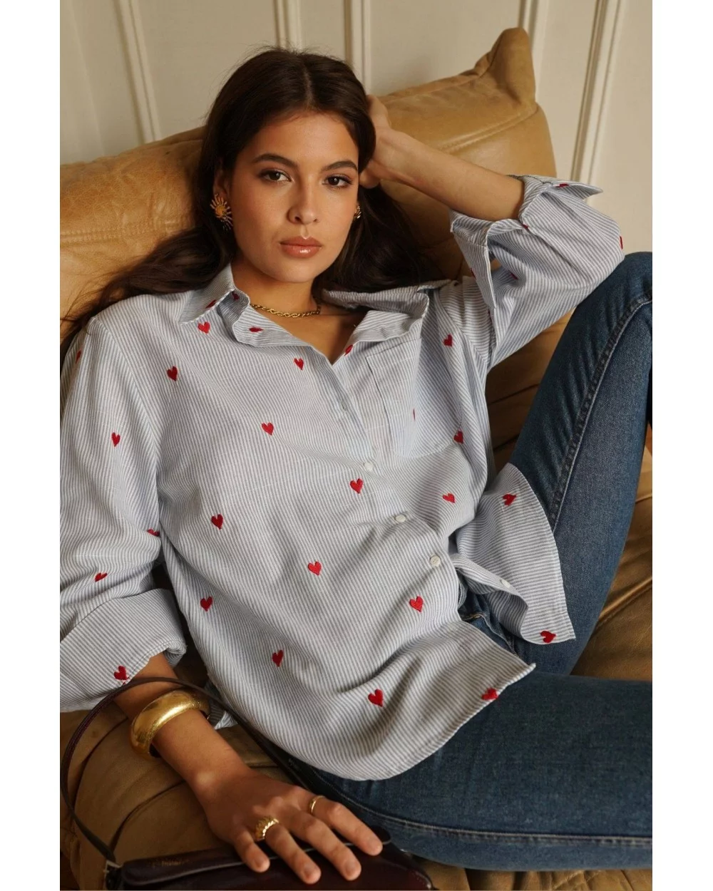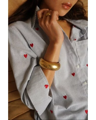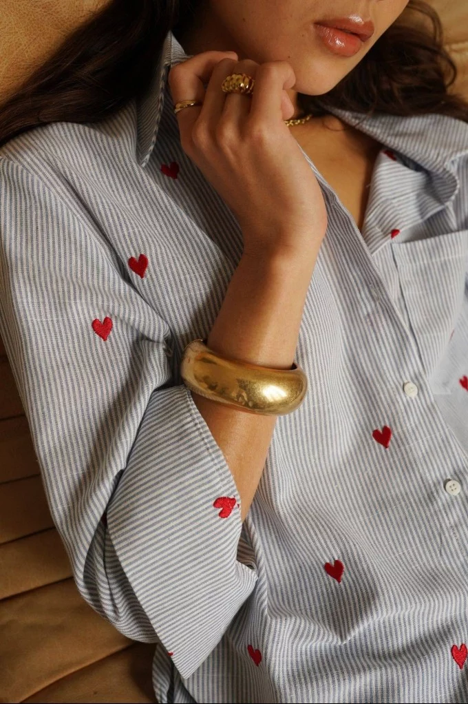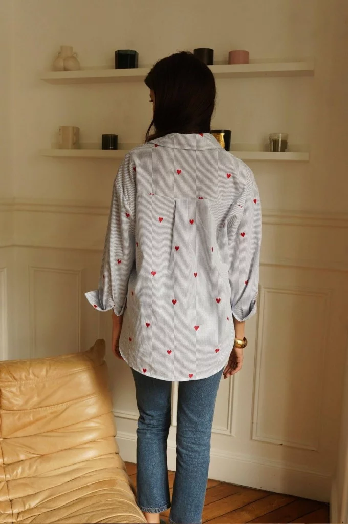 Sur un fond bleu frais, ses petits cœurs roses apportent une touche ludique et romantique, parfaite pour réveiller n’importe quelle tenue. Sa coupe droite et légère en fait une pièce facile à porter, aussi bien rentrée dans un pantalon qu’ouverte sur un débardeur.