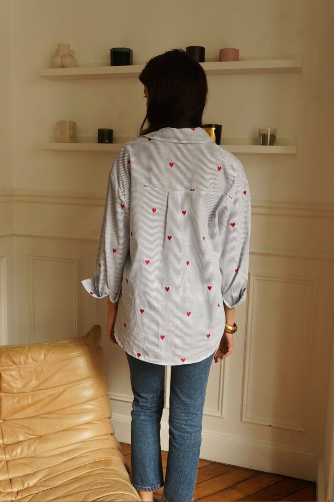 Sur un fond bleu frais, ses petits cœurs roses apportent une touche ludique et romantique, parfaite pour réveiller n’importe quelle tenue. Sa coupe droite et légère en fait une pièce facile à porter, aussi bien rentrée dans un pantalon qu’ouverte sur un débardeur.