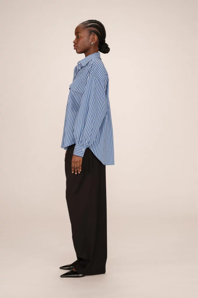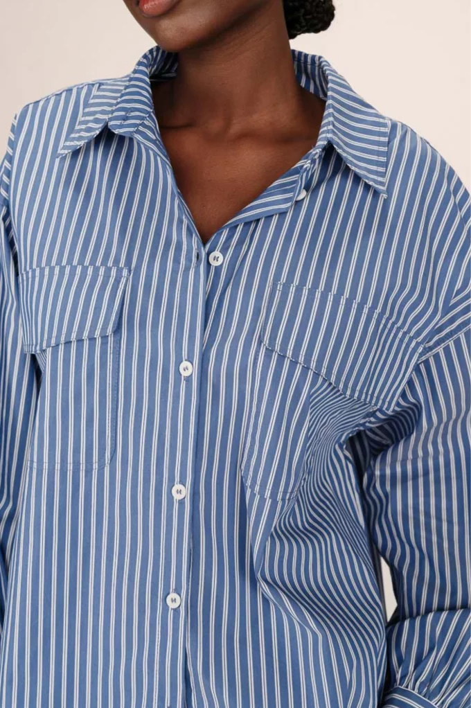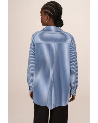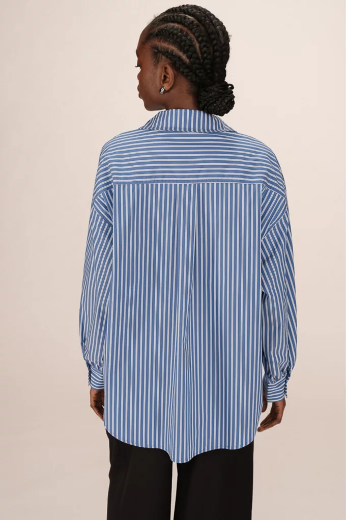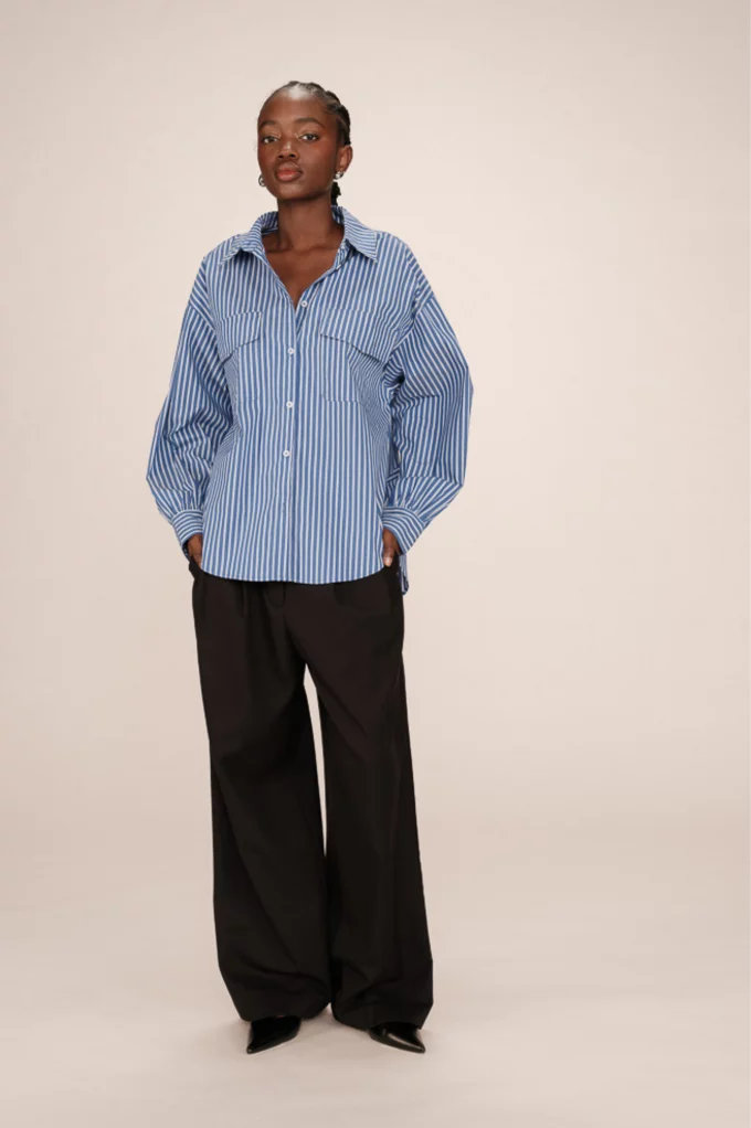 Un classique masculin-féminin revisité avec style ! La chemise Sorbet, en coton rayé bleu et blanc, mise sur une coupe oversize et un col large pour une allure effortless chic.