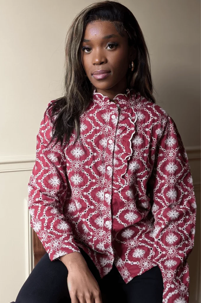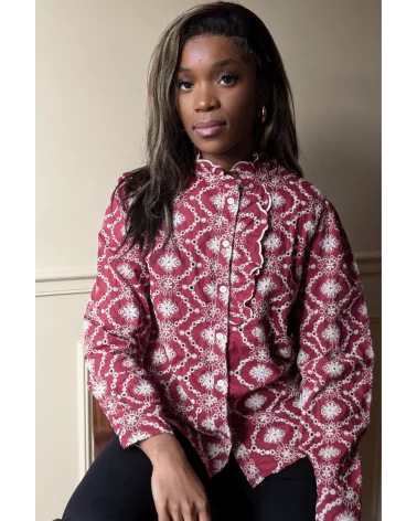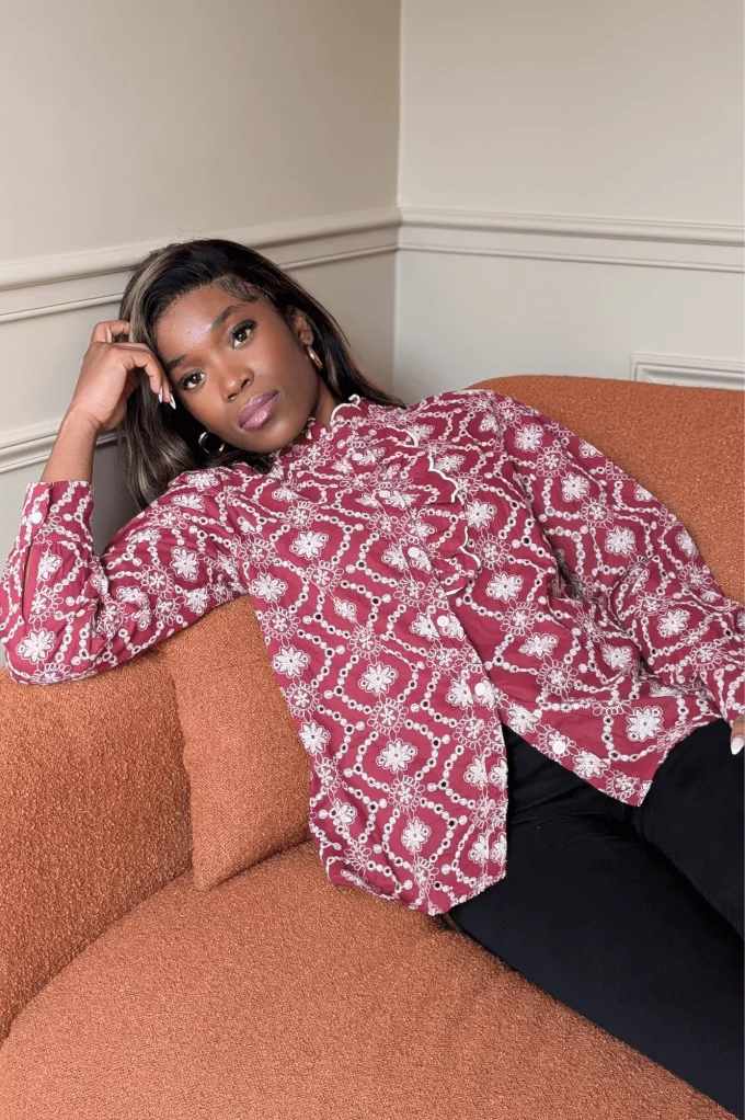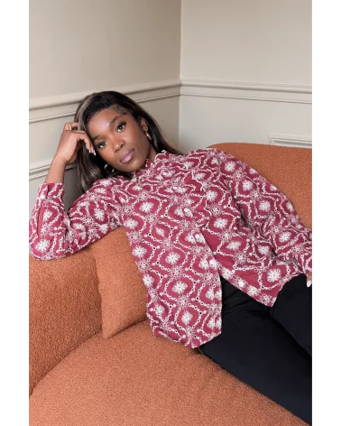La blouse Brigou en bordeaux est un indispensable féminin alliant élégance et originalité. Sa coupe fluide et ses broderies blanches à fleurs apportent une touche romantique et raffinée. À porter seule pour un look chic ou associée à un blazer ou un jean pour un style casual-chic.