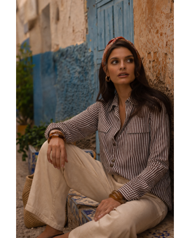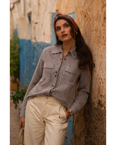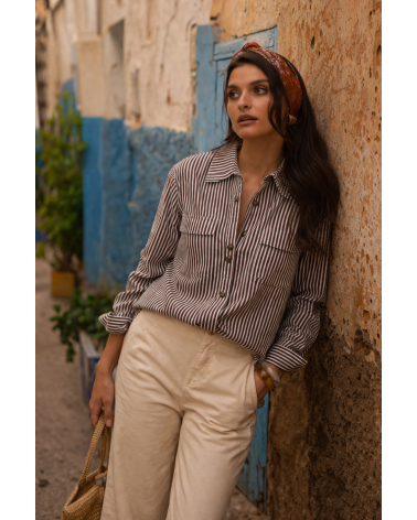 Adoptez un look à la fois structuré et intemporel avec la chemise Kira. Son imprimé à fines rayures marron et blanc apporte une touche élégante et moderne, idéale pour un style effortless au quotidien. Sa coupe droite met en valeur la silhouette tout en restant confortable, tandis que ses poches plaquées sur la poitrine ajoutent du caractère à la pièce.