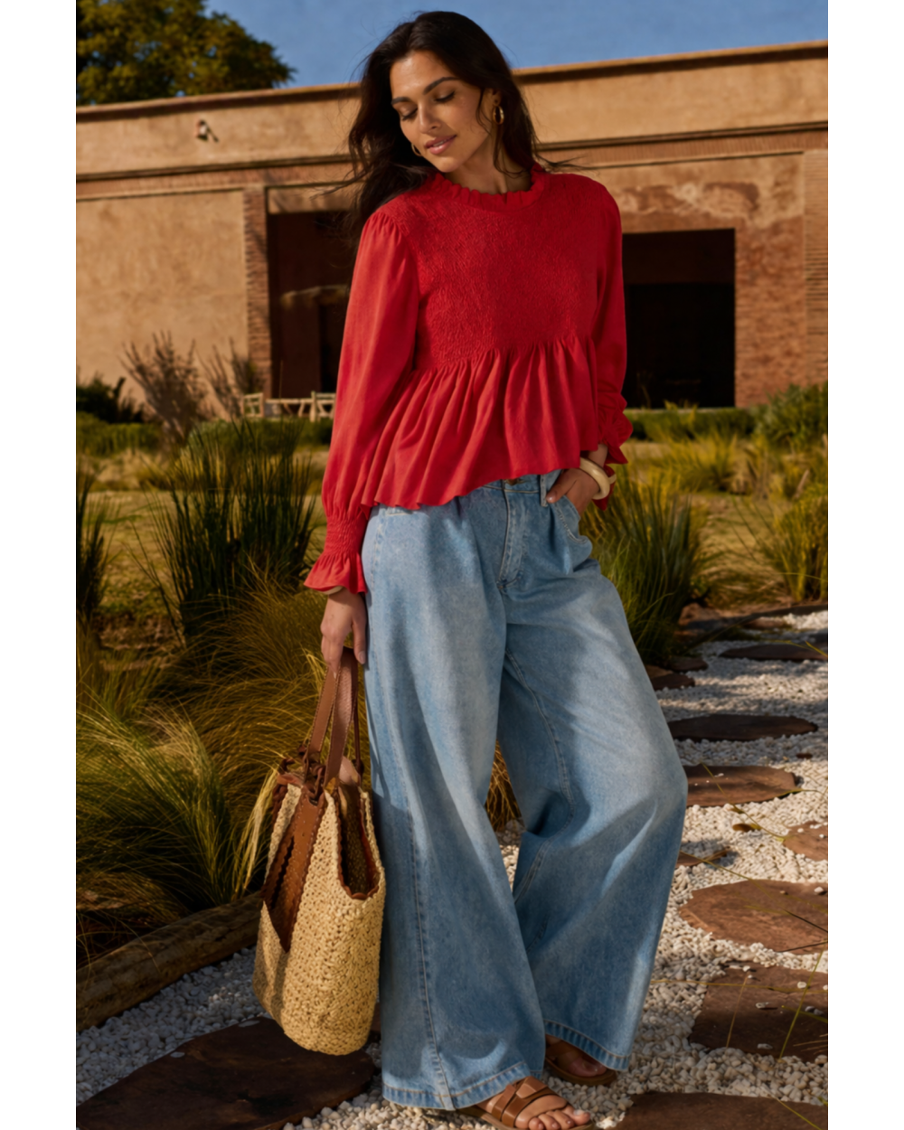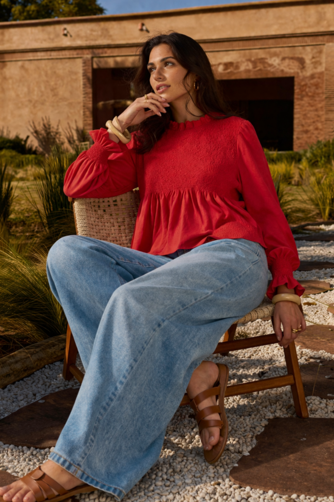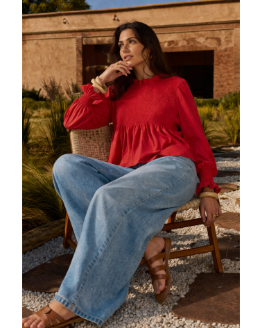 La blouse Suzy séduit par sa teinte rouge éclatante et ses détails féminins. Son buste smocké souligne délicatement la silhouette tandis que sa coupe évasée apporte du mouvement et du confort. Avec ses manches longues légèrement bouffantes et ses poignets resserrés, elle offre une allure élégante et raffinée, idéale pour rehausser un look du quotidien comme une tenue plus habillée.