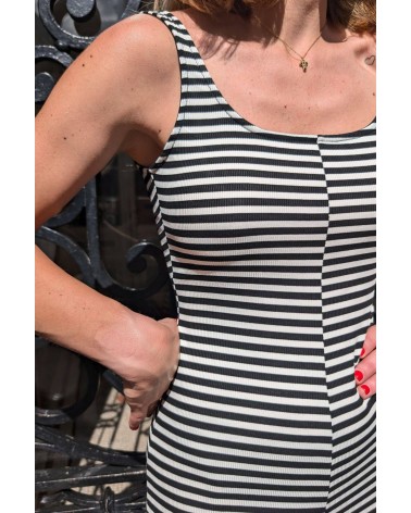 Avec ses rayures noires et blanches, elle impose une silhouette graphique et moderne, tandis que ses fines bretelles ajoutent une touche de légèreté et d’élégance. Sa coupe fluide offre un confort absolu sans compromis sur le style — idéale pour bouger, danser, profiter.