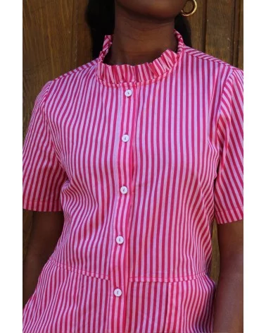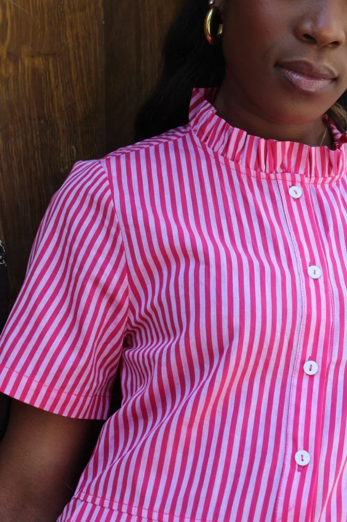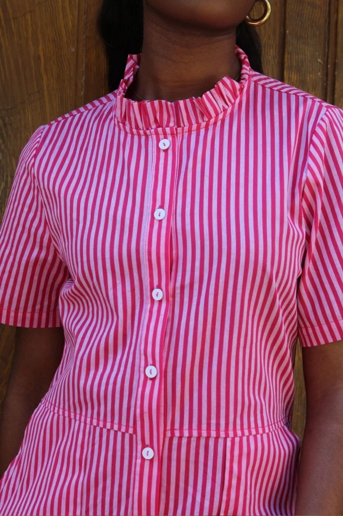 Avec sa teinte rose presque fluo et ses rayures ton sur ton, elle apporte un vrai shot d’énergie et de style. Sa coupe courte et structurée met en valeur les jambes, tandis que les petits froufrous au niveau du col ajoutent une touche fun et féminine. Pratique et stylée, elle est dotée de poches sur les côtés — le détail qu’on adore pour allier confort et fonctionnalité.