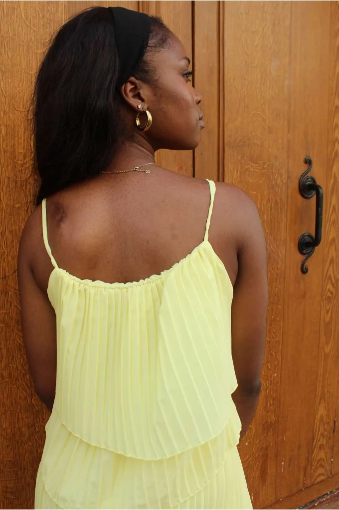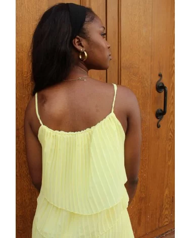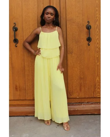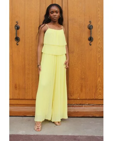 Entièrement plissée, elle joue avec la lumière et les mouvements pour une allure fluide et sophistiquée. Sa teinte jaune apporte une touche de fraîcheur et de douceur, idéale pour une cérémonie estivale ou un mariage. Confortable, moderne et ultra chic, Fluffy jaune est une vraie alternative à la robe.