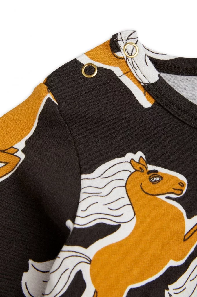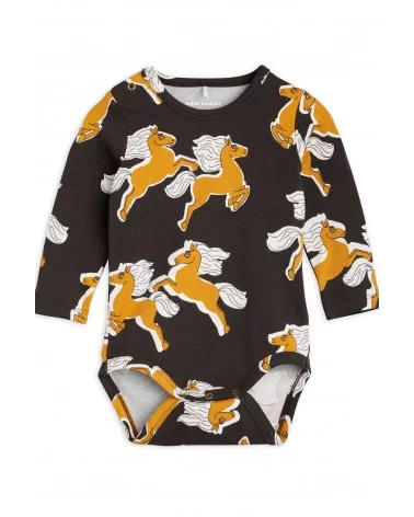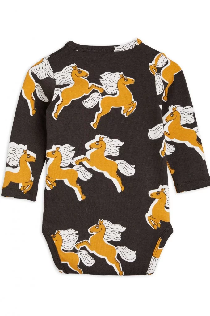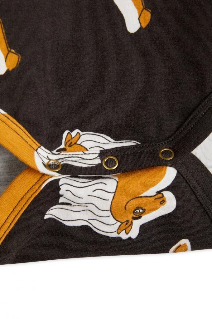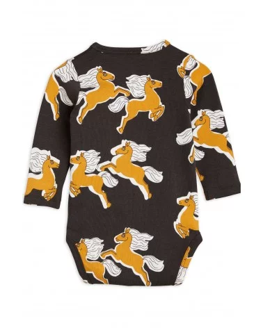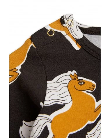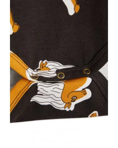 Craquez pour le Body Licorne de Mini Rodini, une pièce confortable et stylée pour votre bébé. Ce body noir à manches longues est sublimé par un magnifique imprimé de chevaux dorés, apportant une touche féerique et élégante. Il est doux pour la peau délicate des tout-petits et respectueux de l’environnement. Son col enveloppe et ses boutons-pression à l’entrejambe facilitent l’habillage et le change. Plus besoin d'hésitez, louez le !