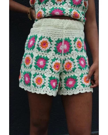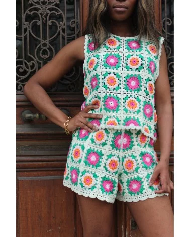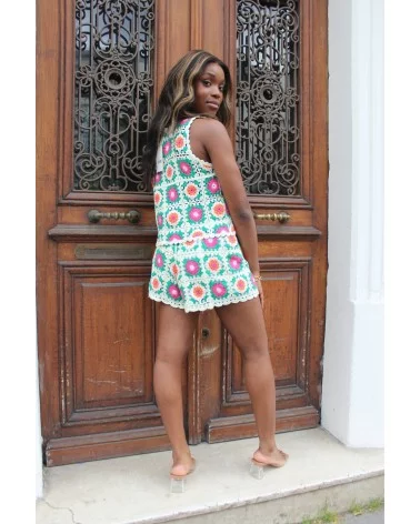 Le Short Étoile est une ode aux seventies. Ce short taille haute est confectionné à la main en crochet avec des carrés “granny square” aux motifs floraux multicolores. Sa coupe courte et confortable est sublimée par des bords festonnés délicats, pour un look fun et rétro à la fois.
