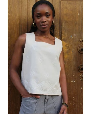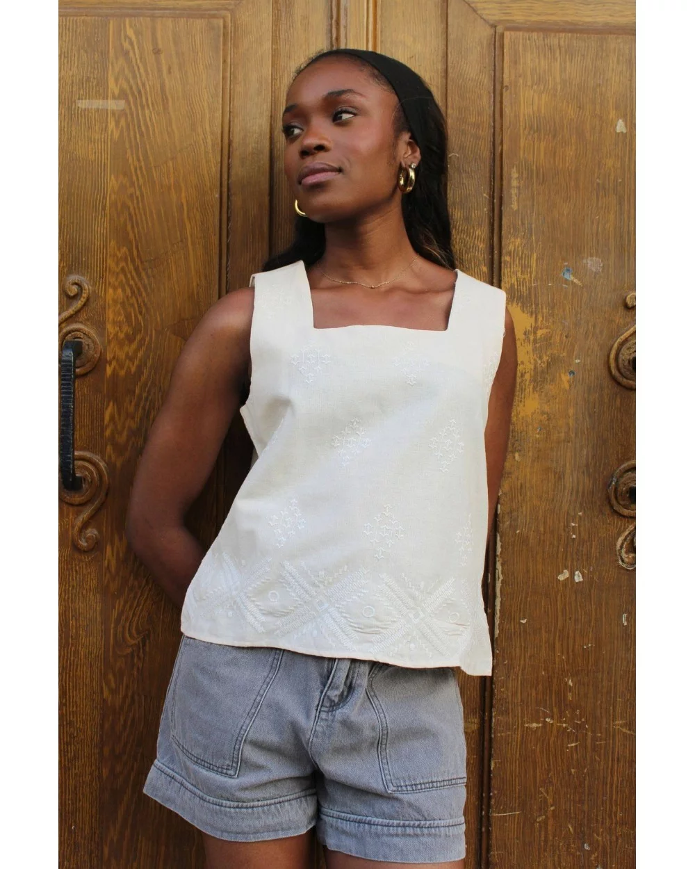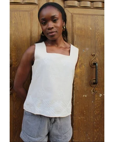 Dans un beige lumineux orné de motifs blonds délicats, il se distingue par son col carré ultra flatteur et ses larges bretelles croisées qui structurent la silhouette tout en restant confortables. Sa coupe féminine en fait une pièce facile à associer, aussi bien avec un jean qu’une jupe fluide.