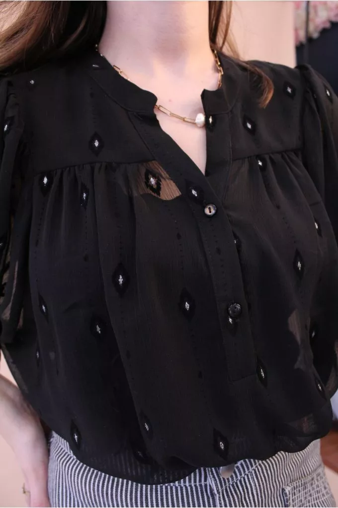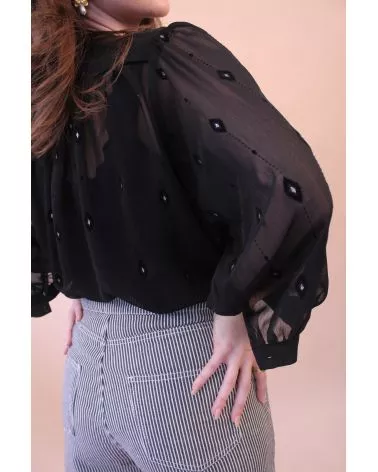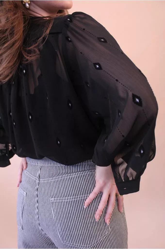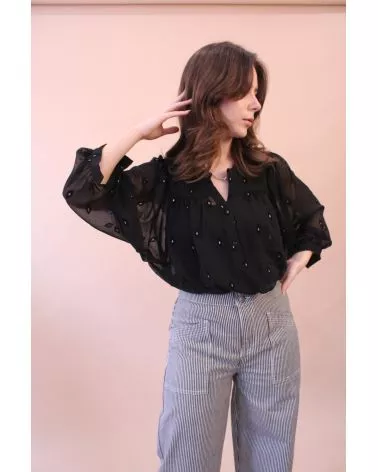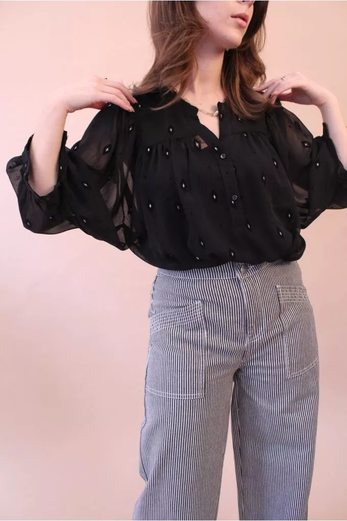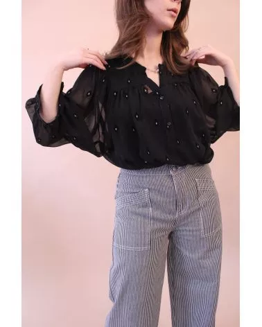 Toute en légèreté, la blouse Pastille se marrie avec tout. Luna la porte ici avec le pantalon Jojo, louez-les !