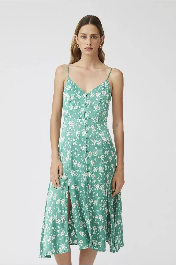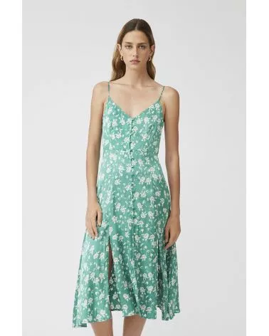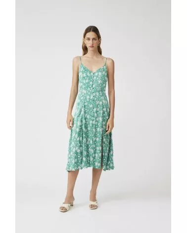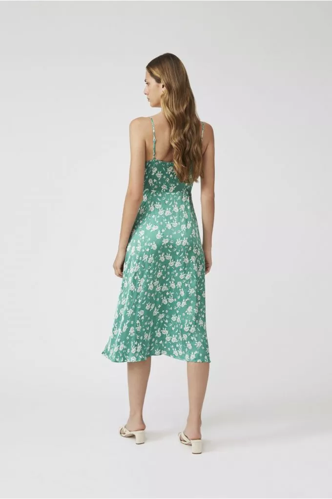 La robe Cyrie est une robe verte, fluide et satinée. Avec son décolleté en V et ses fentes au bas des deux cotés, elle est parfaite pour l'été !