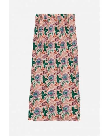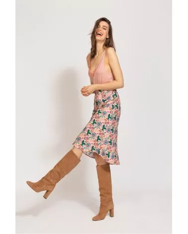 La jupe Gloria Soleneo est une jupe beige avec imprimé fleuris et grosse fleurs. Très chic pour l'été.