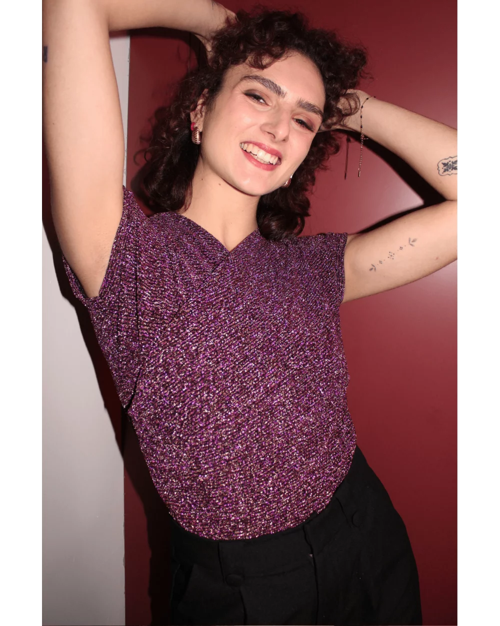 Le top cache-cœur Nina lila à manches courtes est parfait pour vos looks de fêtes. Il n'y a rien de plus festif que des paillettes ! À louer absolument !