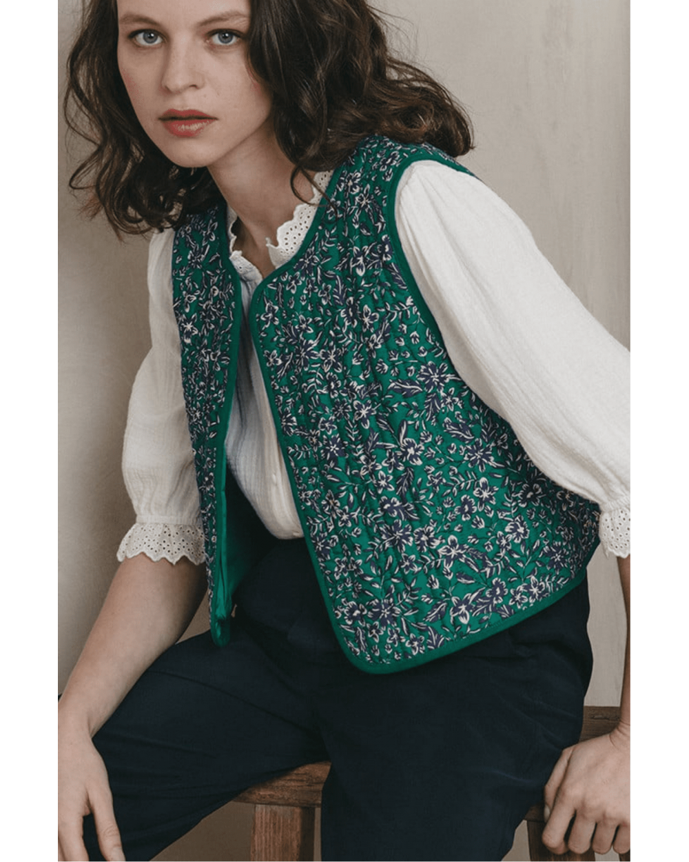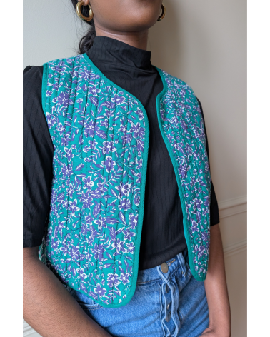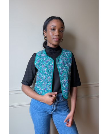 La veste Inoubliable verte est un gilet matelassé, ouvert sur le devant, sans manches avec encolure ronde, un liseré uni devant et des emmanchures. Louez-le toute l'année !