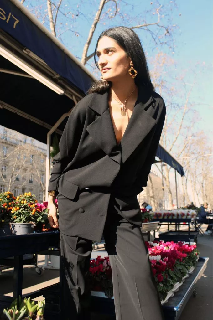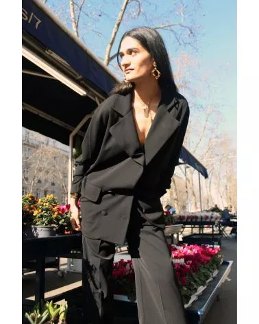 La veste Iseult est un blazer noir oversize à double boutonnage avec un revers assez large. Sublimez vos looks de cette pièce incontournable, louez-la !