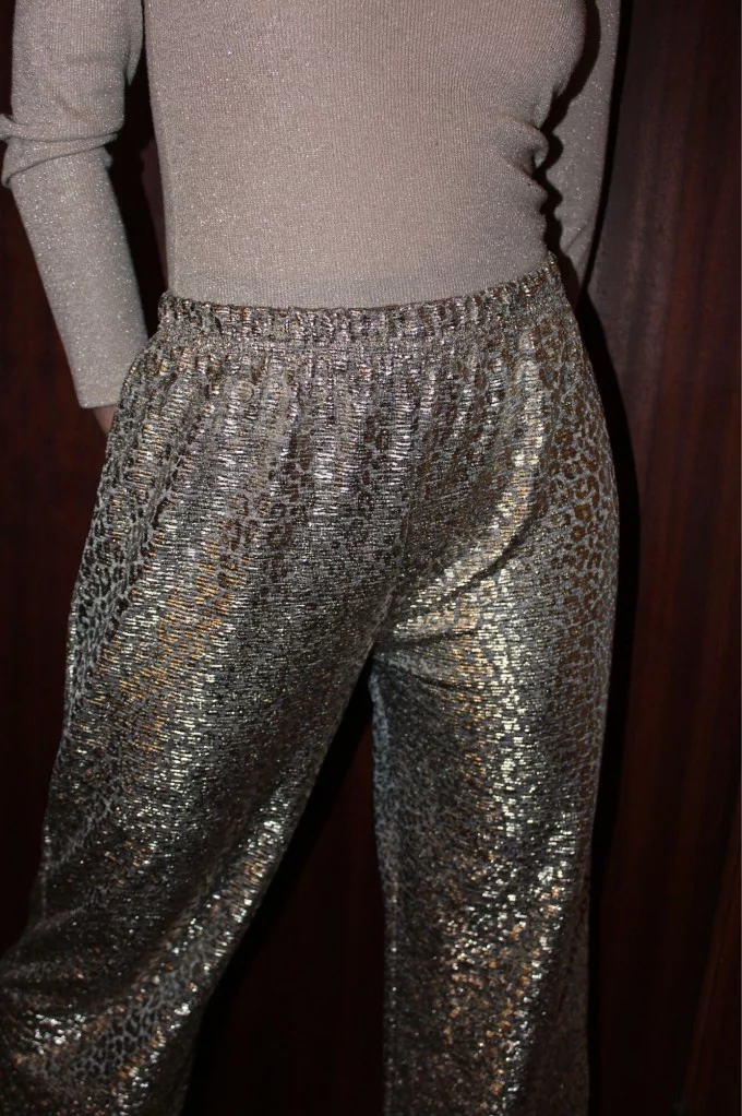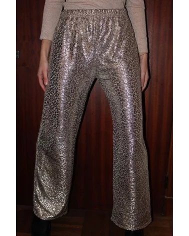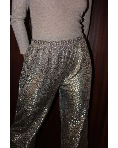 Le Lizia est un pantalon iridescent beige. Son imprimé léopard et son côté irisé scintillant ajoutent instantanément une touche de fun et un côté disco pour un look de fête. Idéal pour les fêtes, il n'attend que vous. Louez-le !