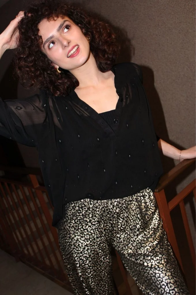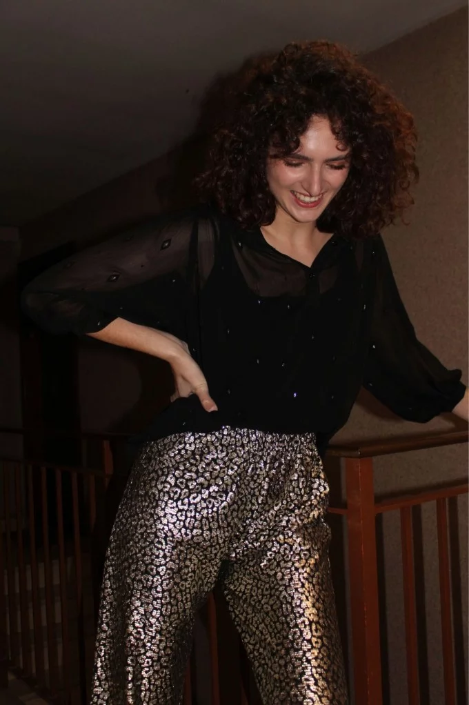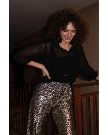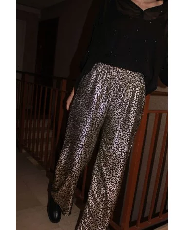 Le Lizia est un pantalon iridescent noir. Son imprimé léopard et ses paillettes ajoutent instantanément une touche de fun et un côté disco pour un look de fêtes. Il n'attend que vous, louez-le !