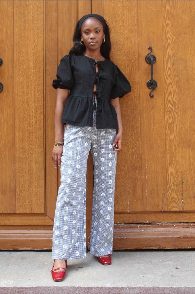 Le pantalon Fleurie mixe l’imprimé vichy et un motif de petites pâquerettes pour une touche fraîche et audacieuse. Sa coupe droite alliée à une taille élastiquée assure confort et facilité au quotidien. Un modèle à la fois rétro et plein de fantaisie, idéal pour illuminer les journées les plus simples.
