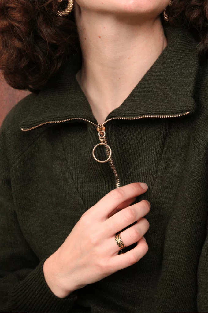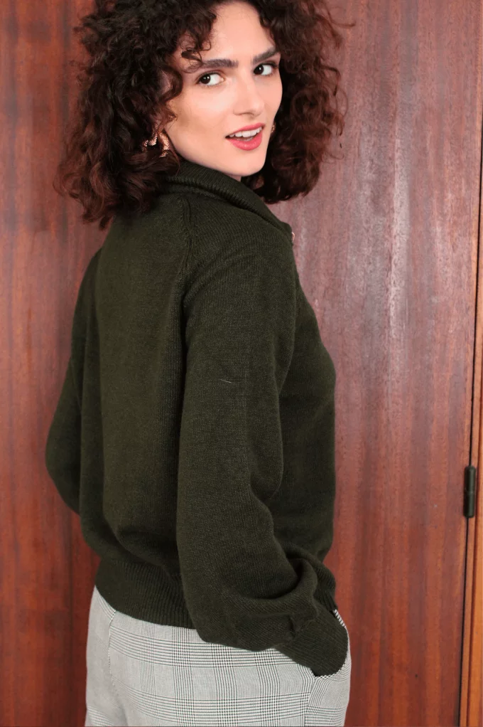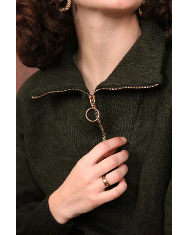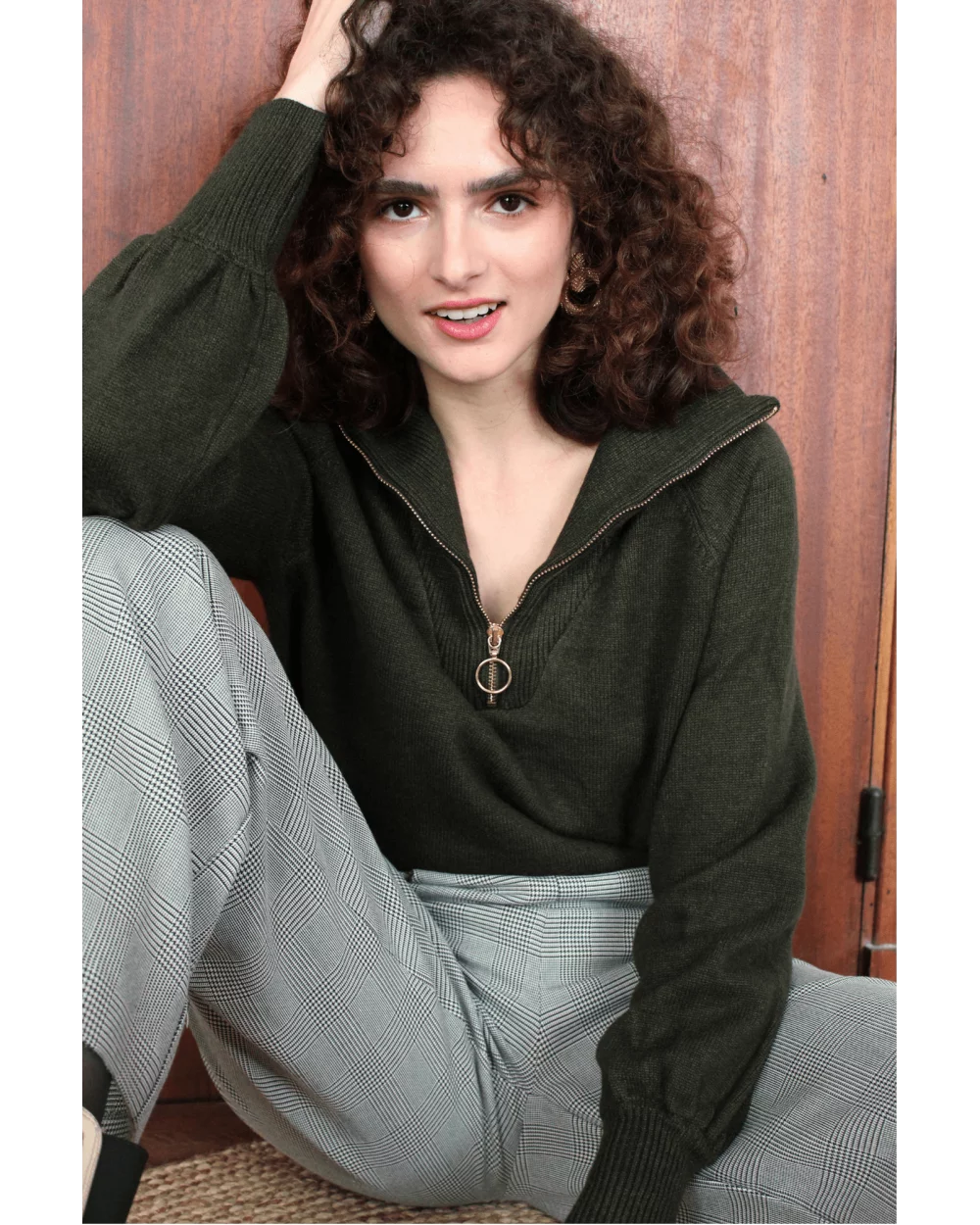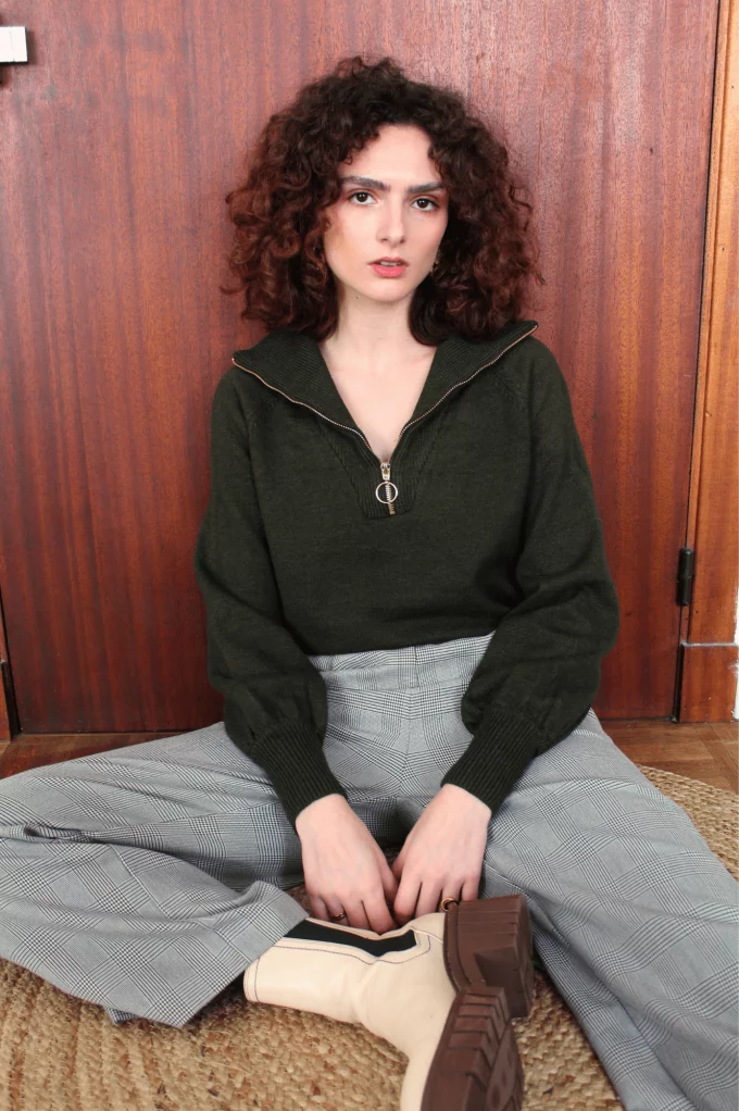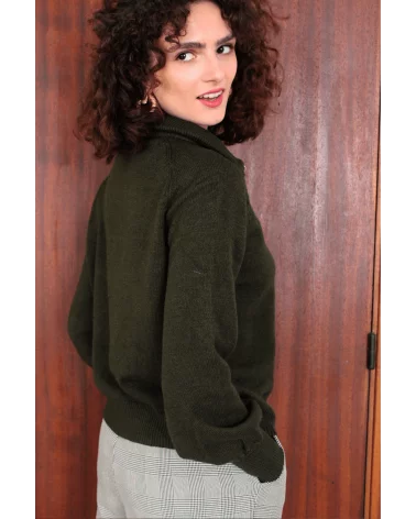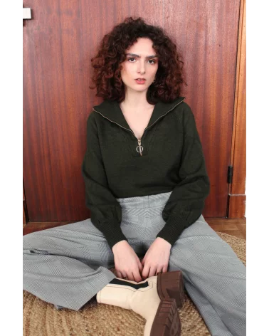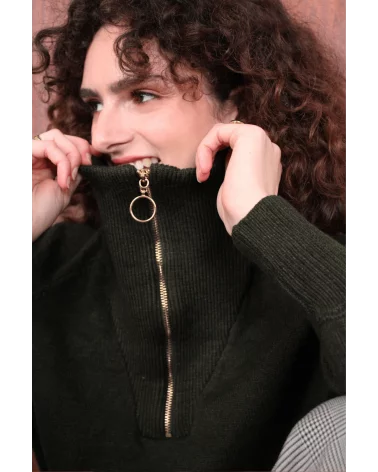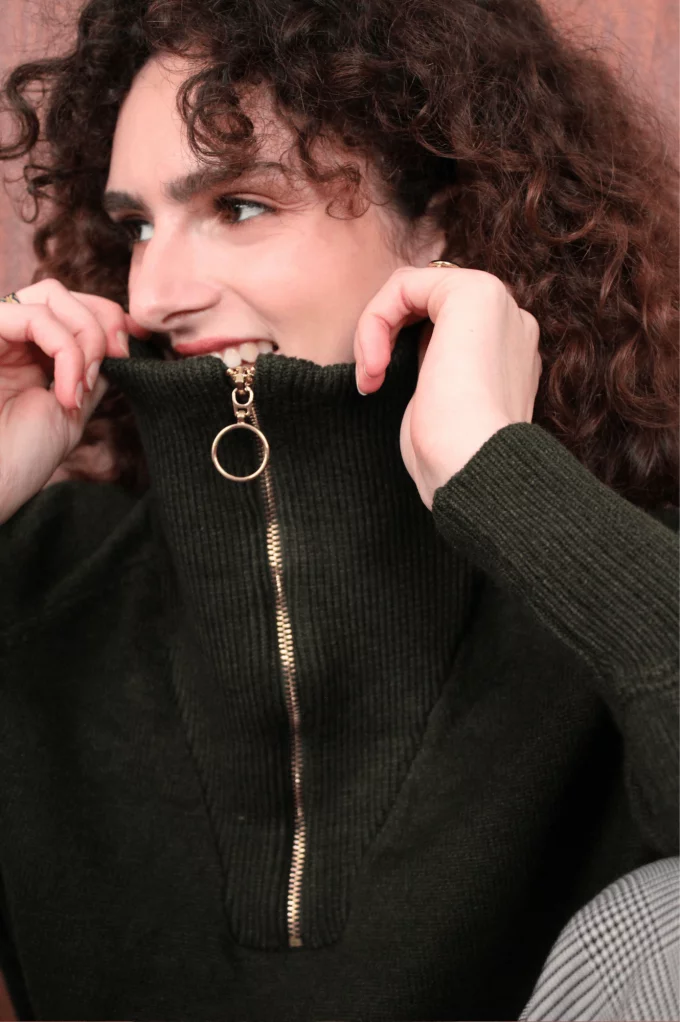Léon, un pull camionneur kaki, est un incontournable de la saison grâce à sa maille chaude et son col haut. Son plus, la fermeture à glissière de couleur or qui apporte la touche finale. À louer pour vos looks d'hiver !