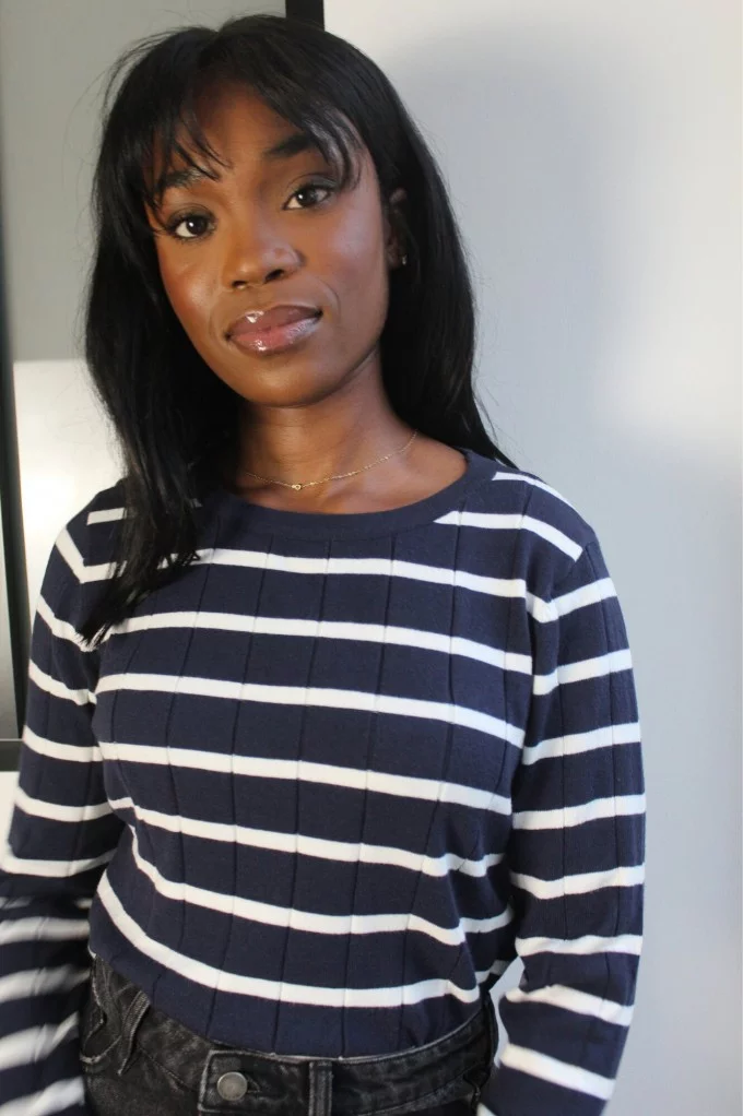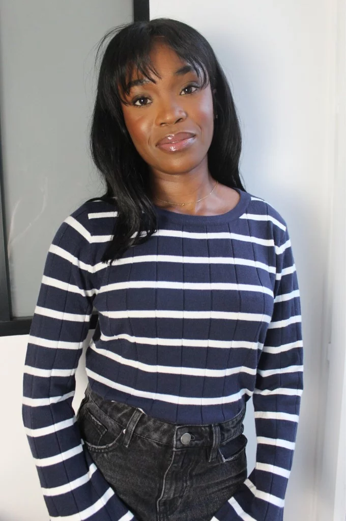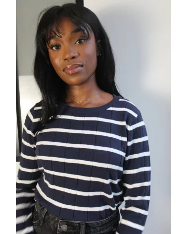 Découvrez le pull Noubia, c'est un pull à rayures marines. Il allie élégance classique et modernité. Avec ses manches évasées et son col rond, il offre un style à la fois chic et décontracté. Confortable et facile à porter, c’est la pièce idéale pour un look casual tout en restant sophistiqué. N'attendez plus, louez-le !