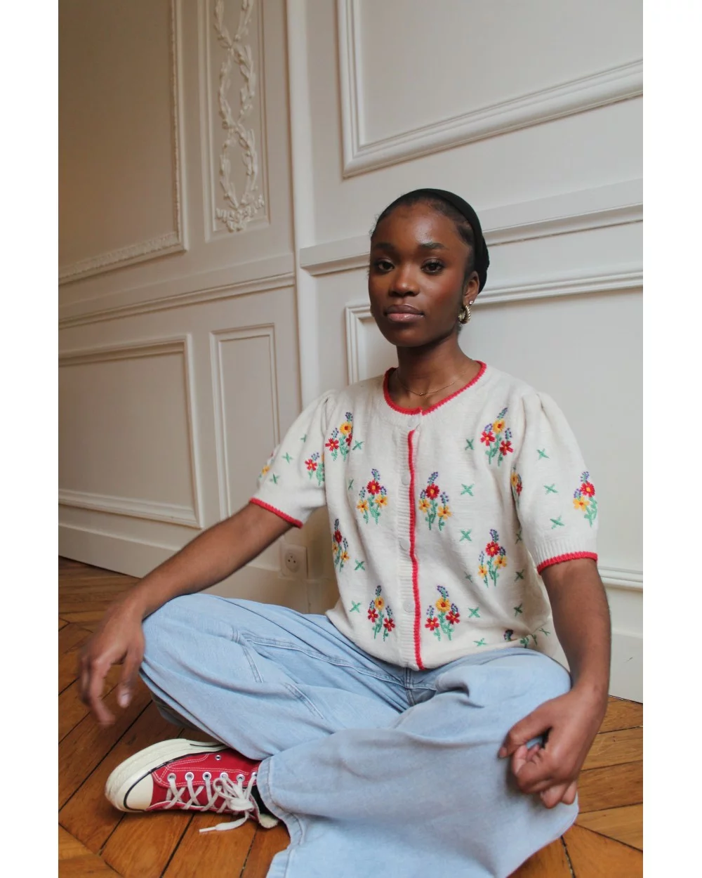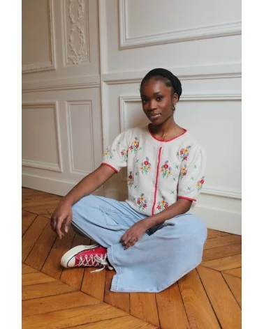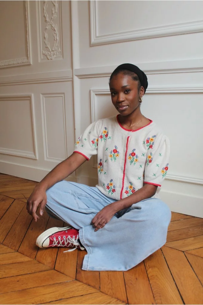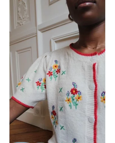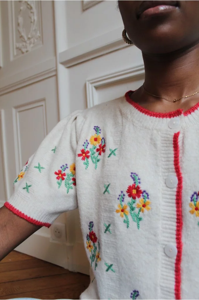 Ajoutez une touche de sophistication à votre tenue avec notre Cardigan Prunelle, magnifiquement orné de broderies à fleures délicates.