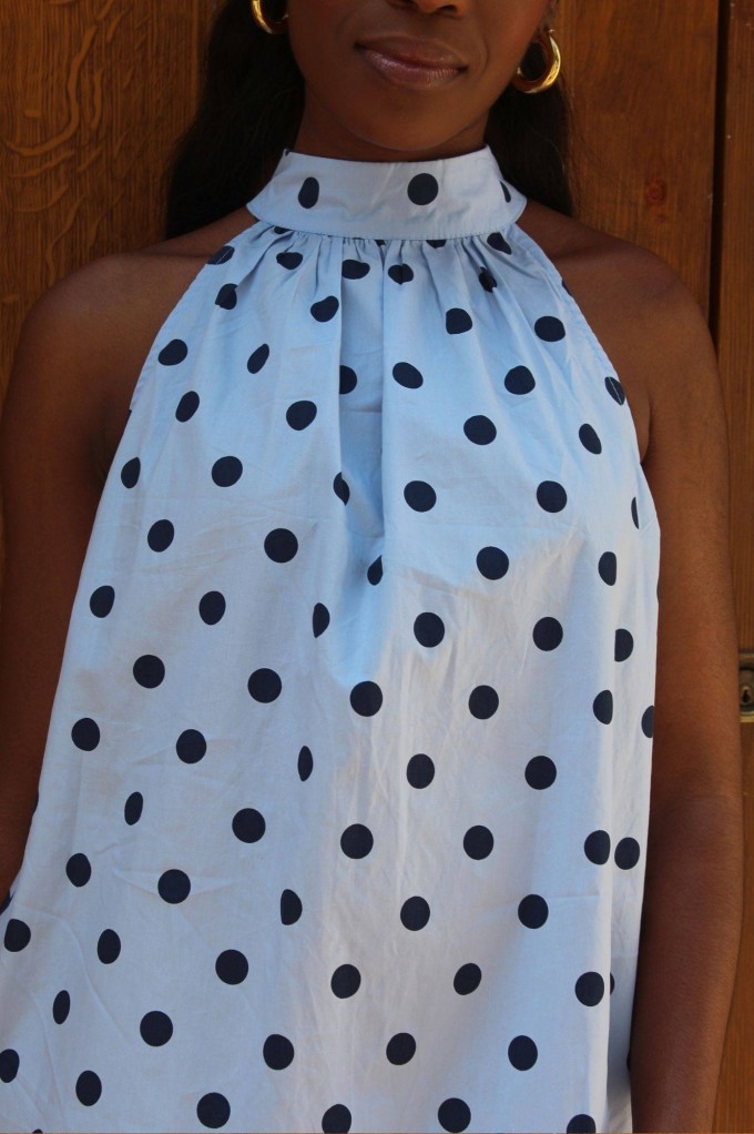Dans un bleu doux, elle est rehaussée par des pois bleu foncé qui lui donnent un look rétro chic. Son atout charme ? Un gros nœud noué au niveau du cou, qui apporte une touche féminine et sophistiquée. Sa coupe courte et fluide offre légèreté et confort pour toutes vos occasions estivales.