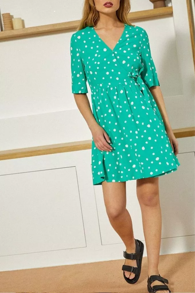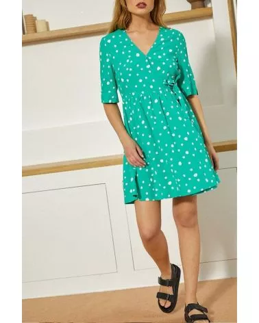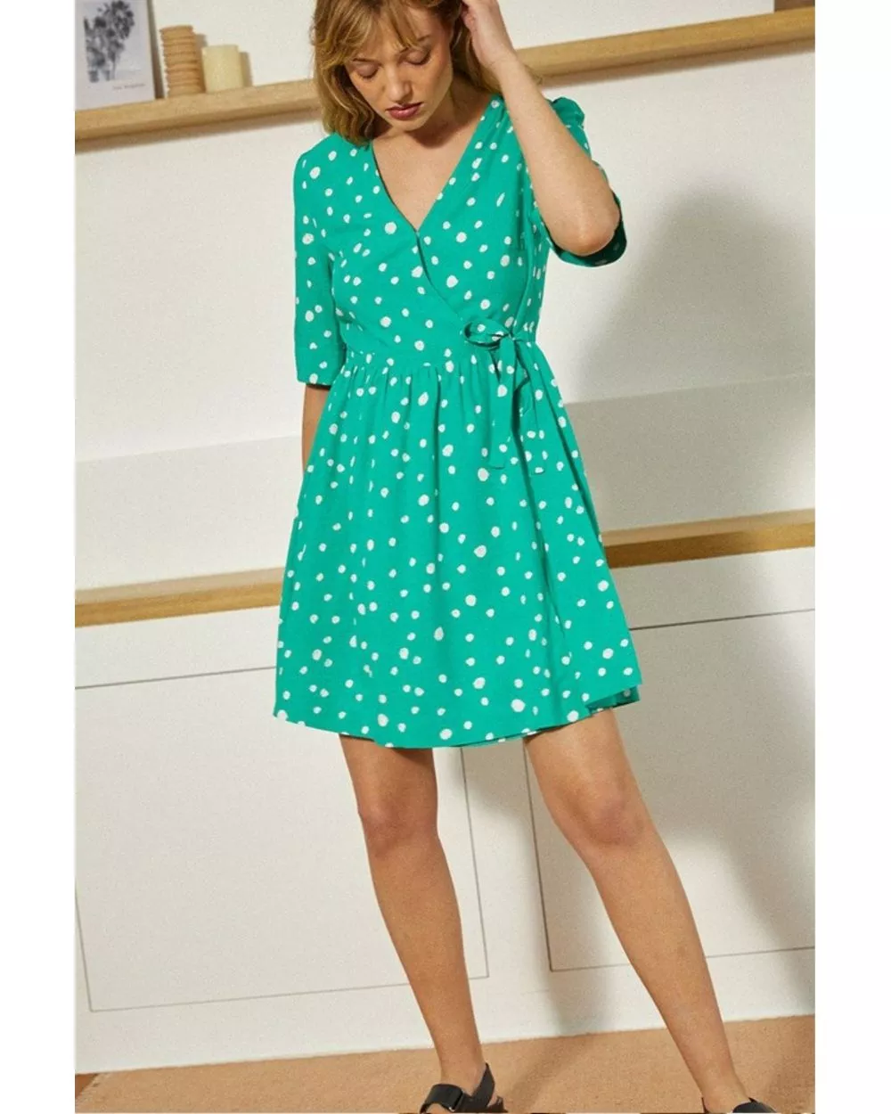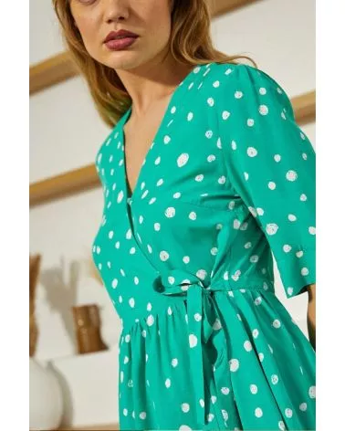 La robe Evelyne est une robe rétro ravissante. Son imprimé pois est un intemporel. Sa coupe cache-coeur équilibre la silhouette et dessine la taille grâce à son lien de tissu a nouer.  Cette robe est idéale pour la demi-saison. Pour un look bohème-casual, on peut la porter avec une paire d'espadrilles et un cardigan en maille loose.