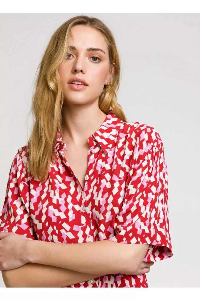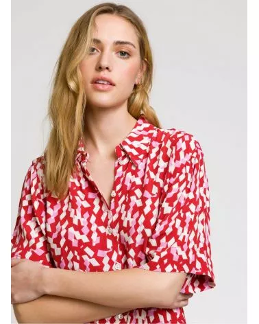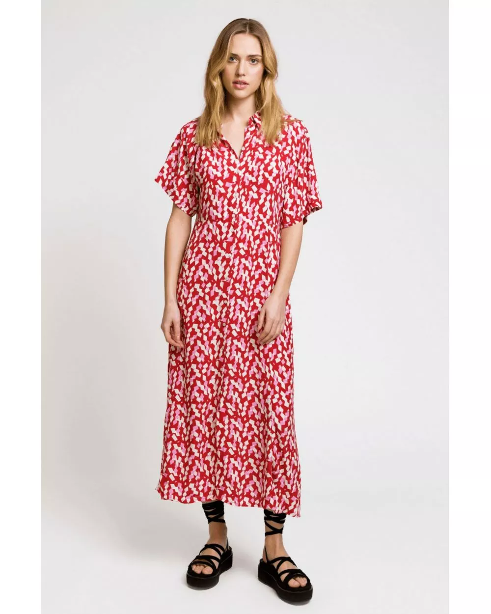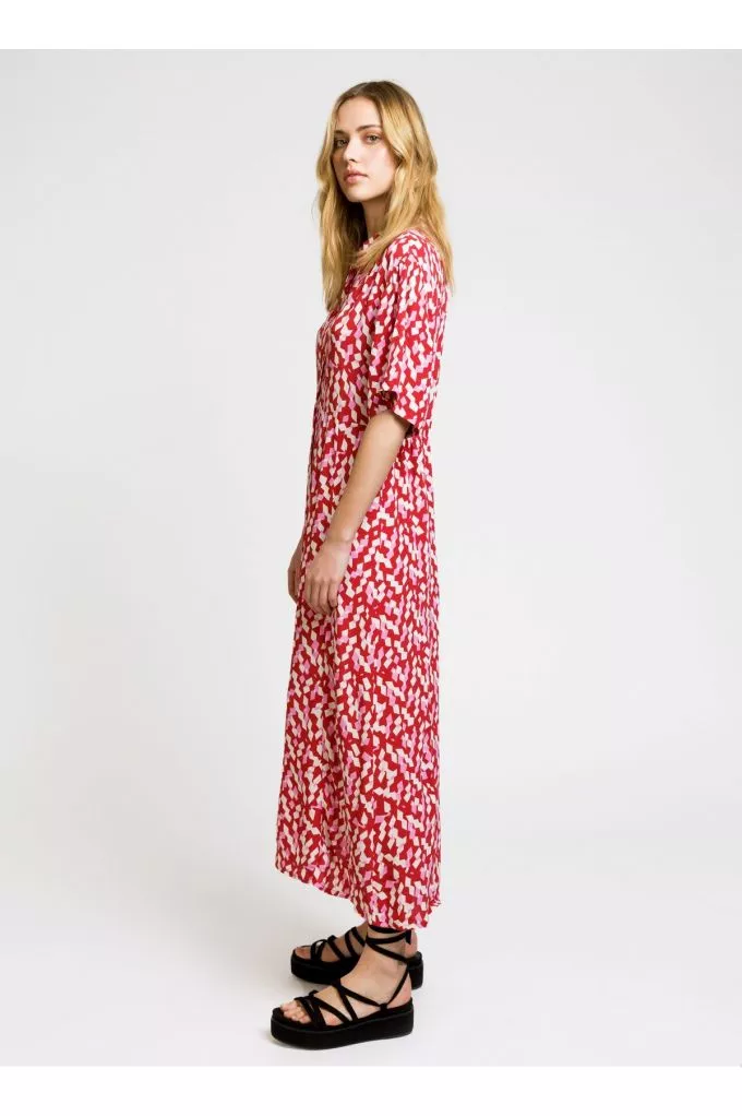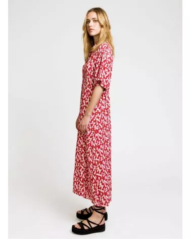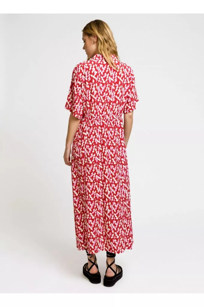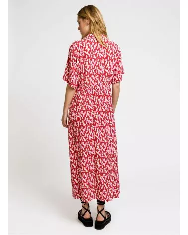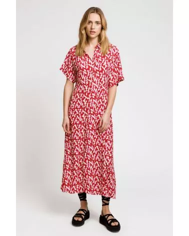 Robe chemise midi Moby est une robe fluide rose et rouge parfaite pour l'été, louez-la !
