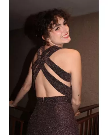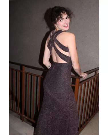 La robe Céleste violette à paillettes est parfaite pour les fêtes. Sa matière fluide et élastique épousera votre silhouette, louez-la !