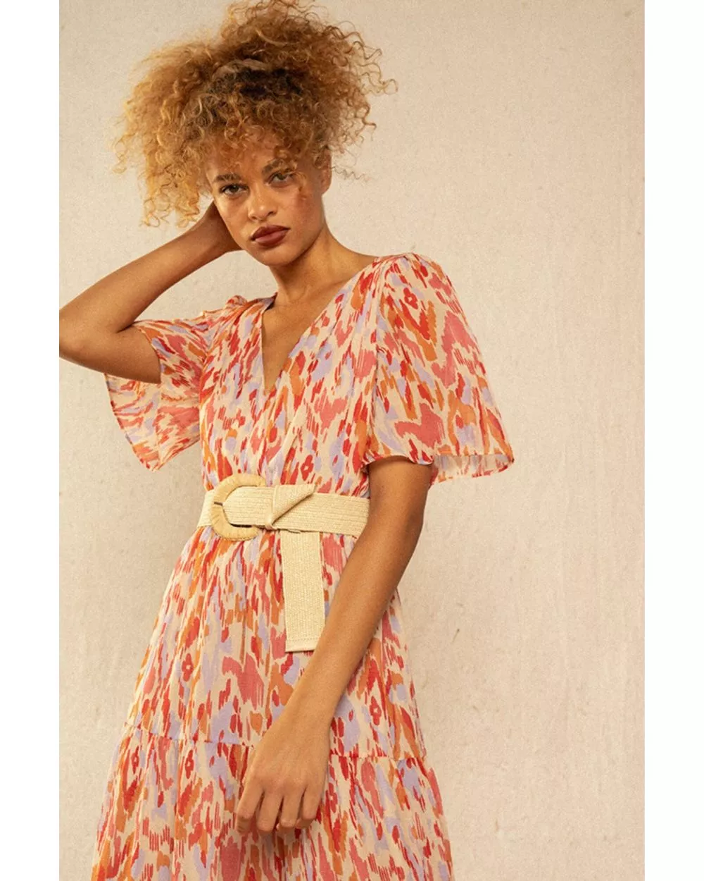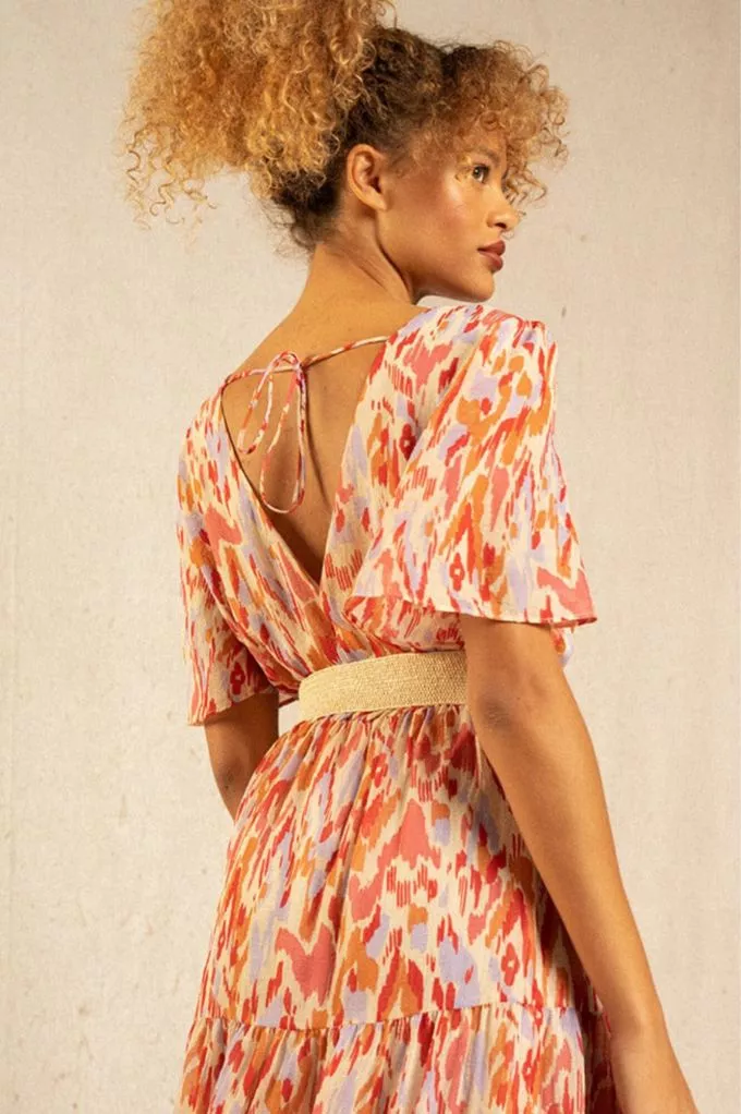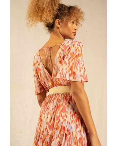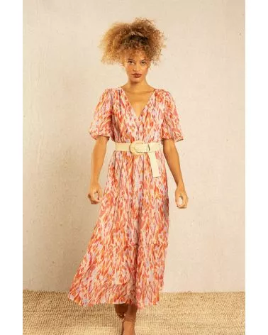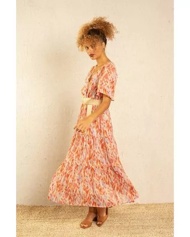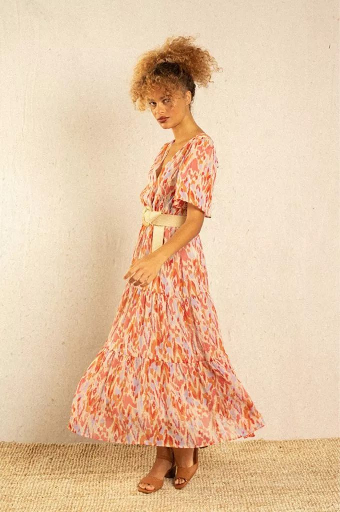 La robe Inca est une robe maxi colorée et bohème resserrée à la taille. Fraîche et pimpante on adore son imprimé tacheté ! Louez-la !