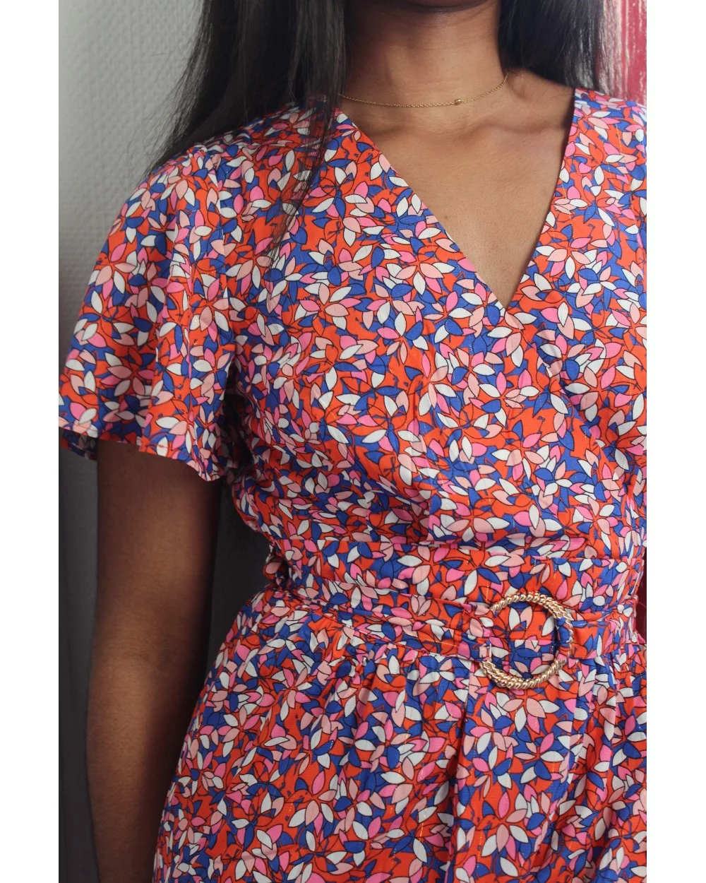 Gabriella mesure 1m63 et porte une taille S. La robe taille normalement, prenez votre taille habituelle.