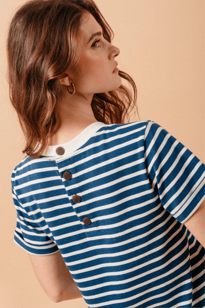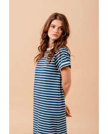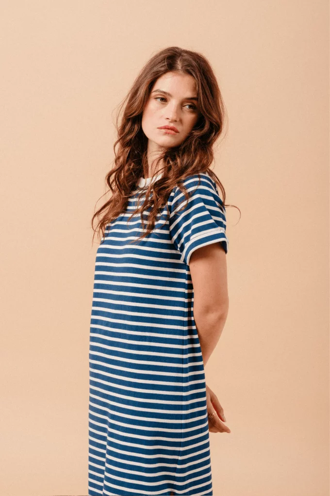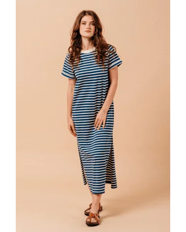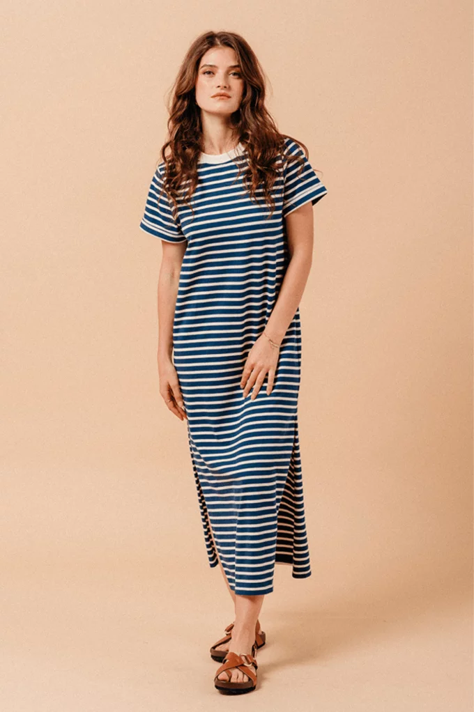 Montmartre est une robe longue imprimée style marinière en jersey. Sa coupe droite et son encolure ronde sublimerons les courbes de chaque femme. On adore son style décontracté et ses fentes sur les côtés qui laissent place aux mouvements.  Louez-la !