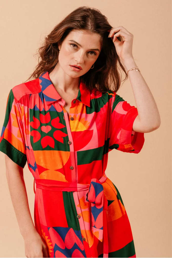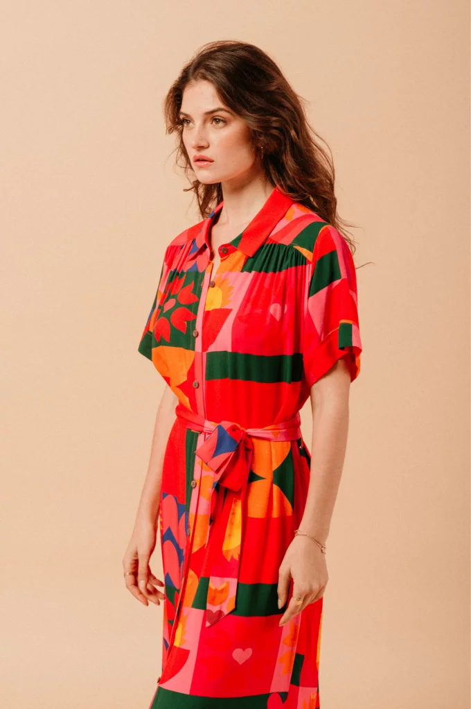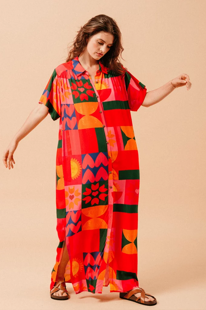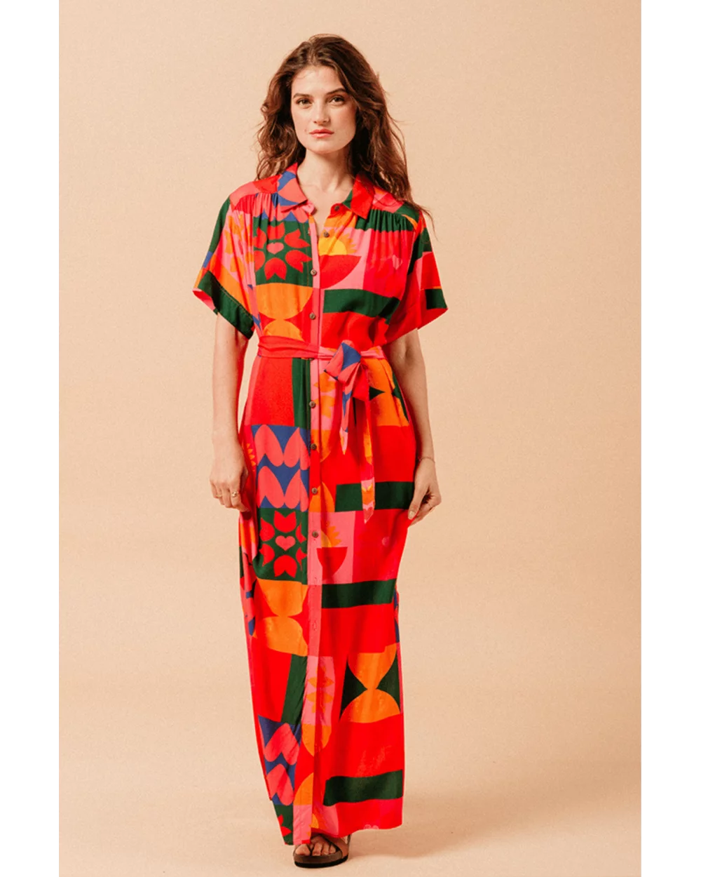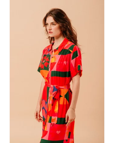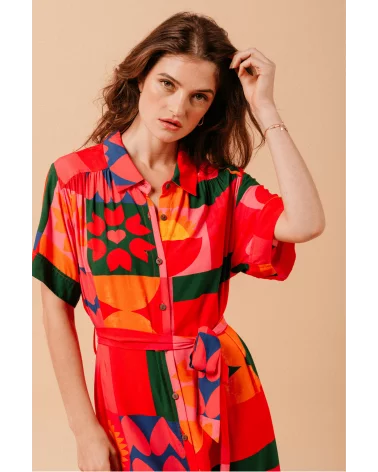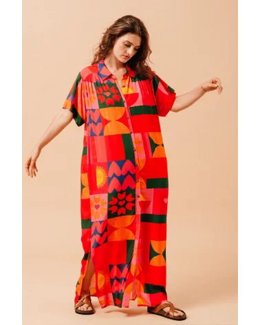 Miel est une robe chemise longue avec des manches courtes. Son imprimé se pare de couleurs éclatantes pour la saison chaude. Sa coupe fluide et décontractée font le charme de cette robe. Ultra agréable à porter, elle vous offrira une silhouette aérienne et féminine. N'attendez plus, louez la !