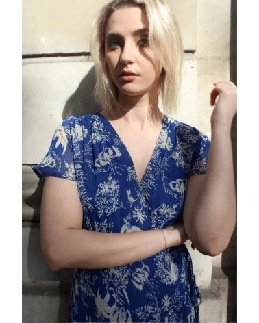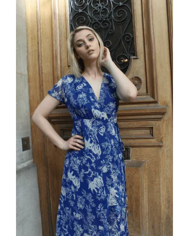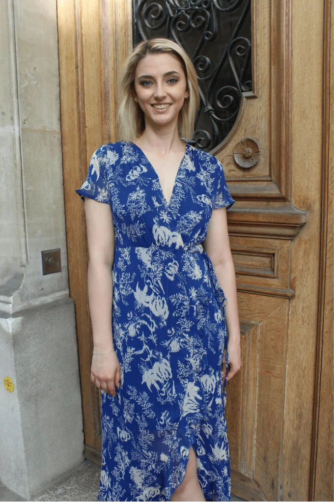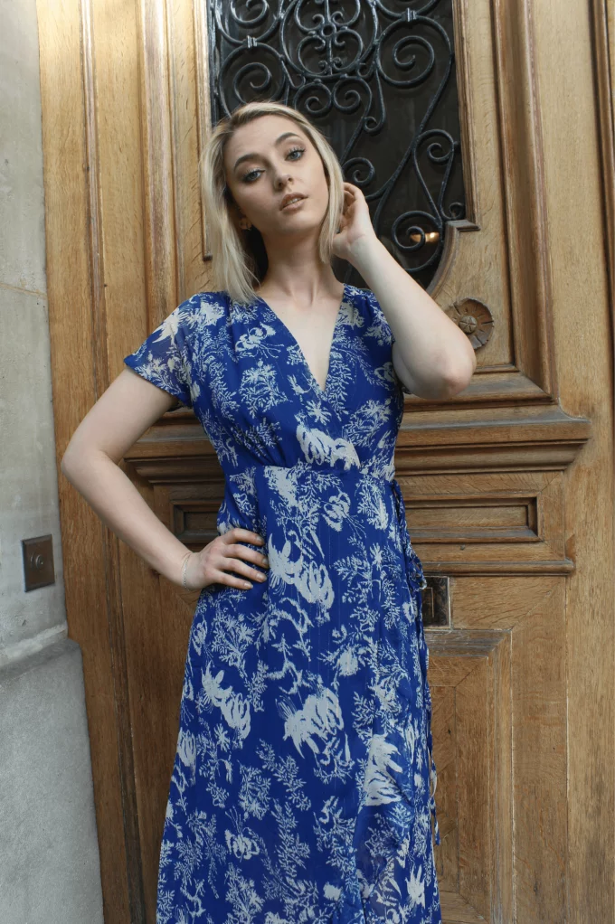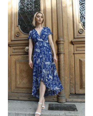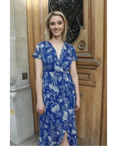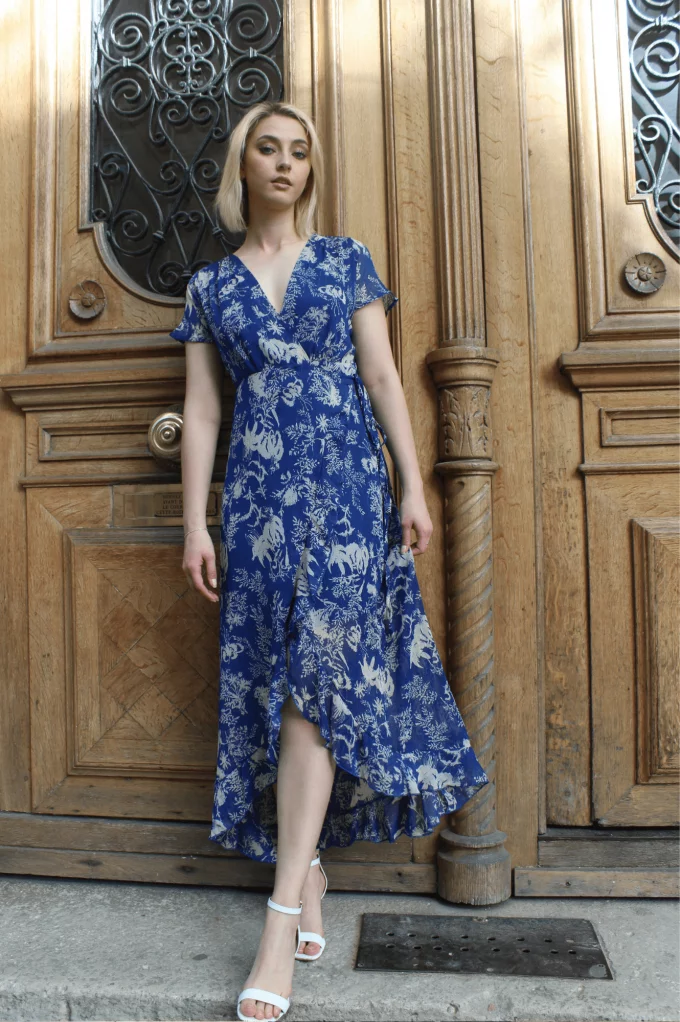 Norva est une longue robe portefeuille à volants. Son tissu léger et fluide épousera votre silhouette unique. On adore son motif floral qui la rend élégante et estivale. Louez-la pour vos cérémonies cet été, vous serez la plue belle de la soirée garanti !