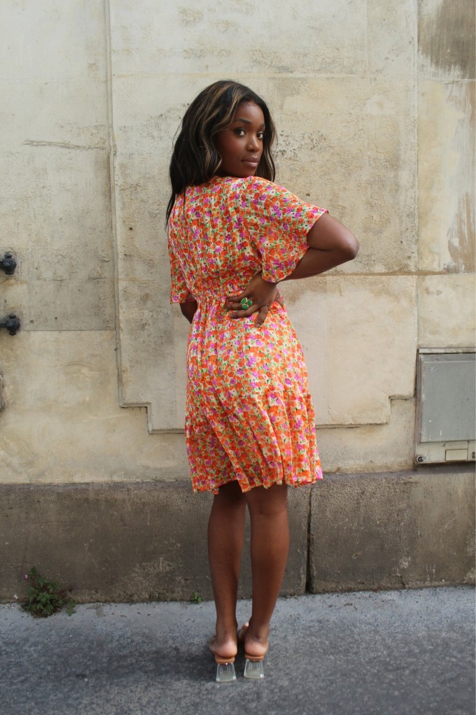 Fraîche, joyeuse et fluide, la robe Ondine est un hymne à l’été. Son imprimé fleuri multicolore sur fond orangé illumine la silhouette, tandis que sa coupe empire et ses manches papillon apportent une allure bohème irrésistible. Conçue pour virevolter au rythme de vos journées ensoleillées, elle se porte aussi bien en terrasse qu’en escapade à la campagne.