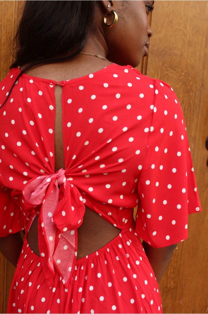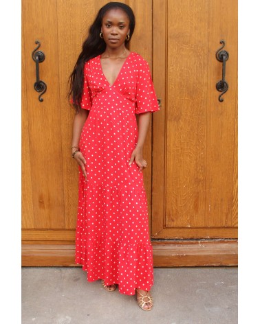La robe Petits Pois séduit par son imprimé à pois rouges et sa coupe longue et cintrée. Légère et fluide, elle dévoile un décolleté subtil et une finition volantée en bas de jupe. Un modèle féminin et intemporel, à porter aussi bien en journée qu’en soirée.
