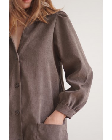 Cette robe courte à la coupe droite en velours côtelé offre un look urbain et chic. Son style écolier la rend singulière et facile à porter. A porter avec une paire de baskets pour une sortie entre amies.