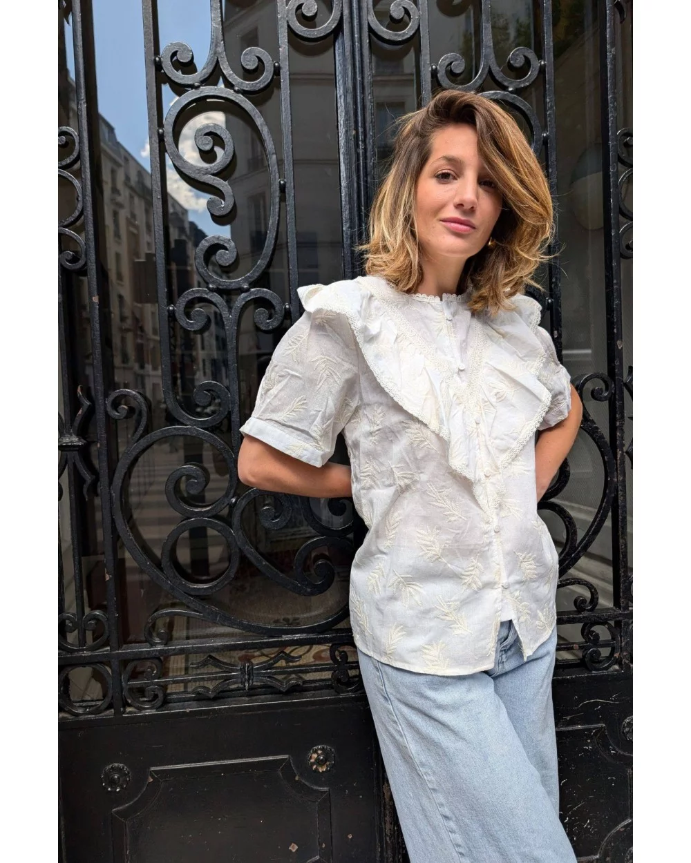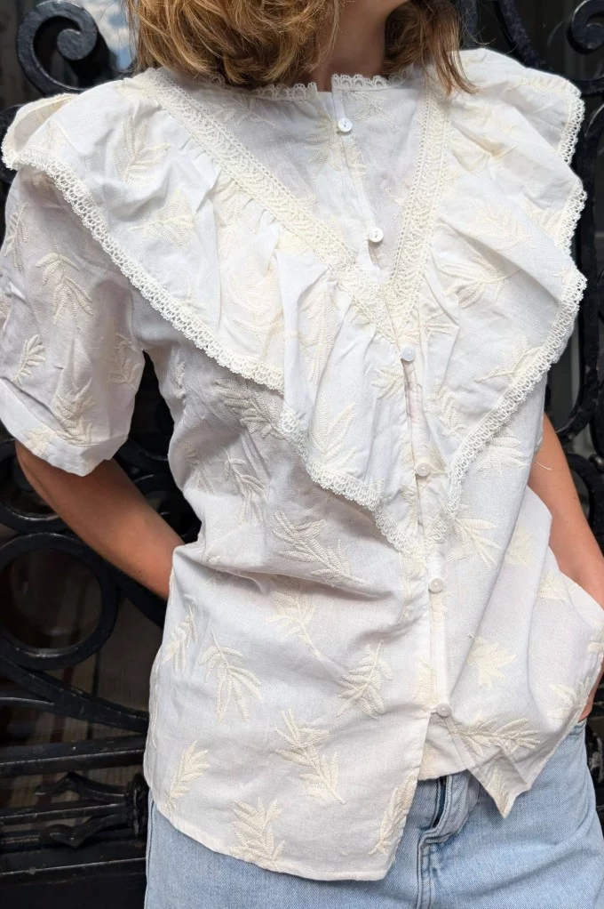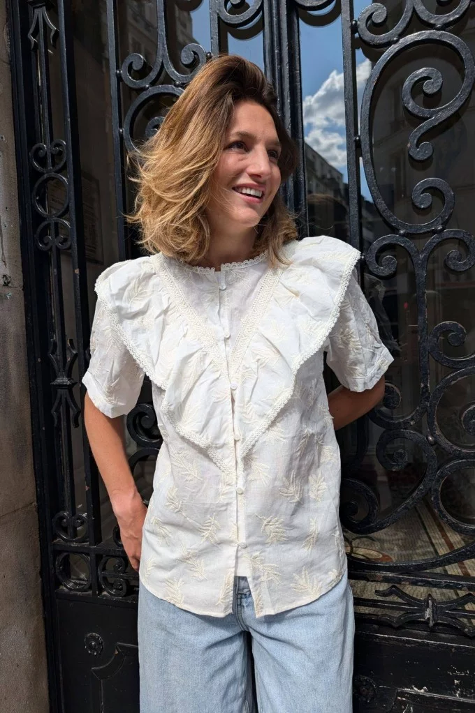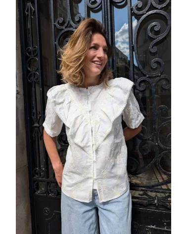 - Blouse blanche à froufrous et motifs ton sur ton