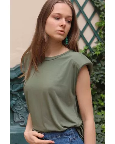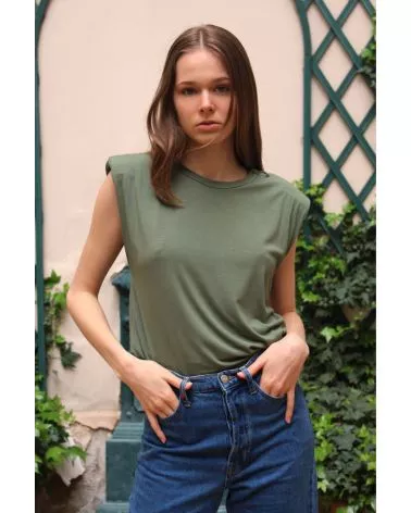 Le T-Shirt Iva est un haut sans manche kaki. Ce T-shirt à épaulettes est un basique revisité pour votre garde robe ! Louez-le pour vos looks du quotidien !