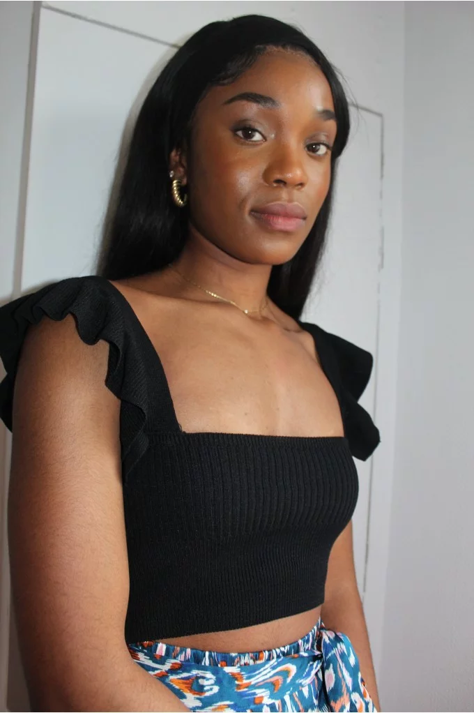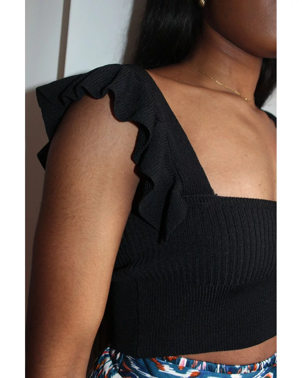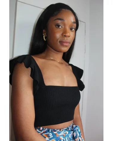 Le top Olpha est un top noir en jersey à volant sur les épaules. On adore ses volants, la touche de sophistication avec un côté glamour idéale pour tous vos looks d'été. Alors, louez-la !