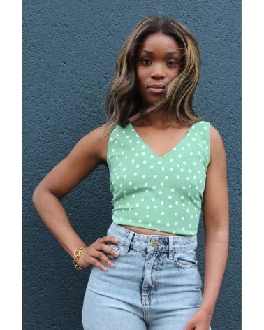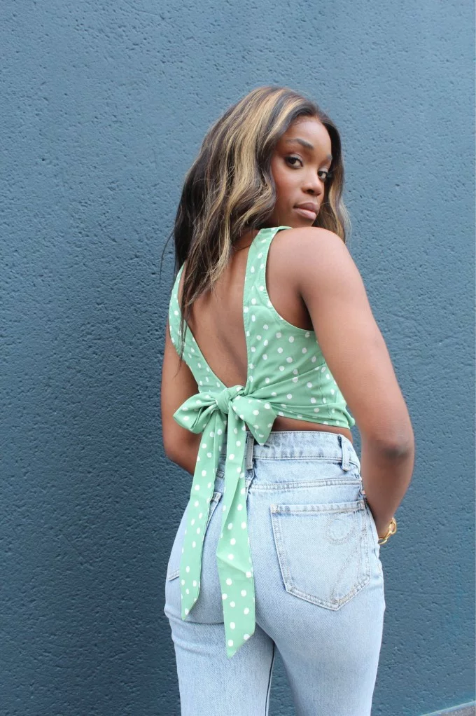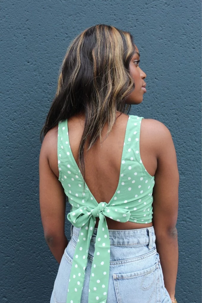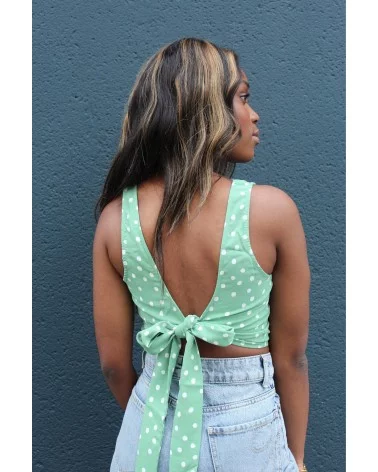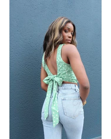 Avec son imprimé à pois et son sublime nœud dans le dos, le top Dune est une déclaration de style à lui seul. Ce haut vert tendre à pois blancs évoque les belles journées ensoleillées et les looks vintage réinventés. Son dos nu noué ajoute une touche de sensualité maîtrisée, idéale pour un brunch entre copines, un pique-nique chic ou une virée estivale en ville. À porter avec un jean taille haute pour un look effortless et romantique.