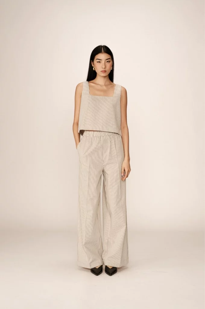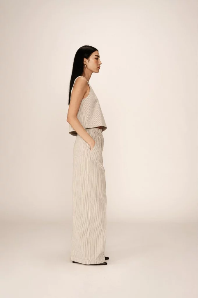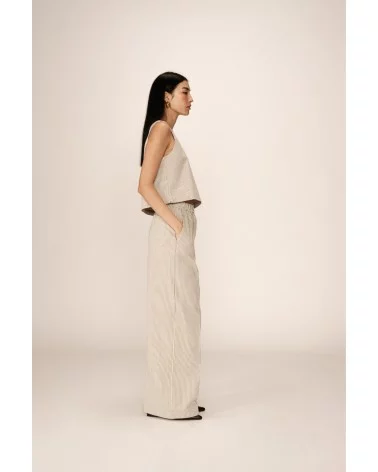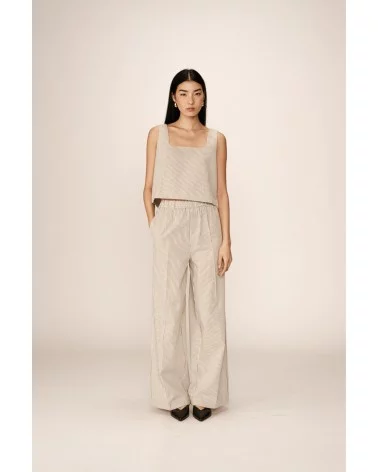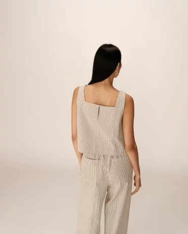 Le top PEANUT mise sur une simplicité moderne avec ses lignes épurées et son tissu à rayures en fibres naturelles. Sa coupe droite et sa longueur courte offrent une silhouette nette et actuelle. Sans manches, avec une encolure carrée et une ouverture boutonnée dans le dos, il est aussi pratique qu’élégant.