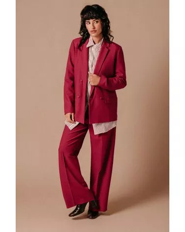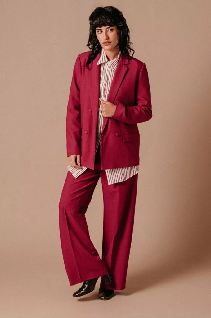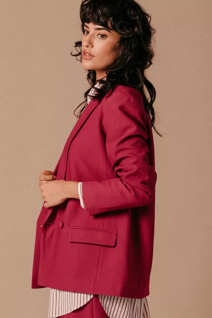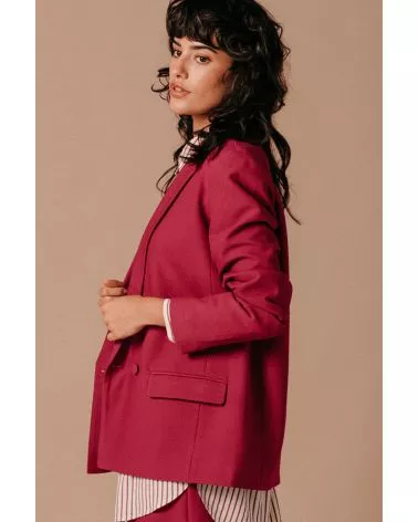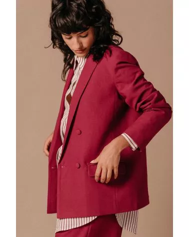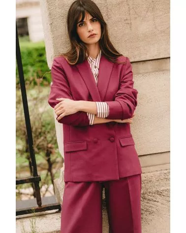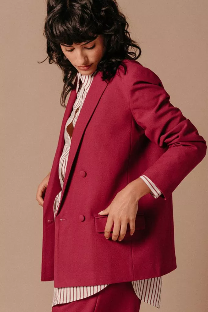 La Veste Lea pivoine est un blazer croisé à manches longues avec des boutons tissus qui lui donnent sa touche de modernité. On aime le porter avec un T-Shirt, un pantalon assorti et des baskets pour un look fun, pop et pétillant, ou une blouse blanche et des talons pour une tenue glamour et coquette. Louez-la, elle n'attend que vous !