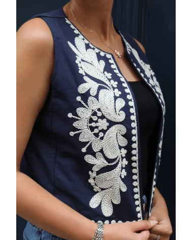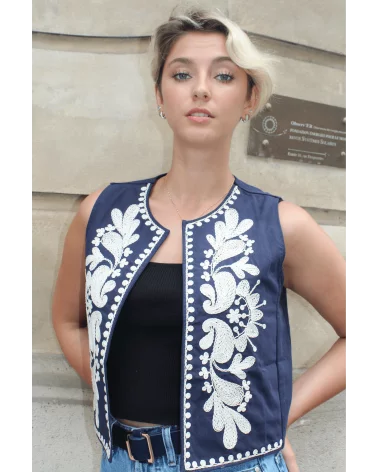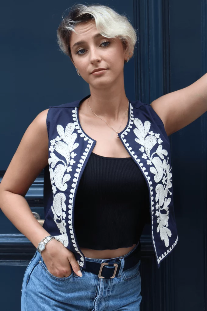 Ajoutez une touche de sophistication à votre tenue avec notre Gilet Nino à manches courtes, magnifiquement orné de broderies blanches délicates. Ce gilet est la pièce parfaite pour rehausser instantanément vos looks, combinant élégance et simplicité. À louer absolument !