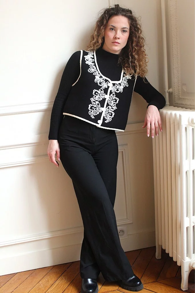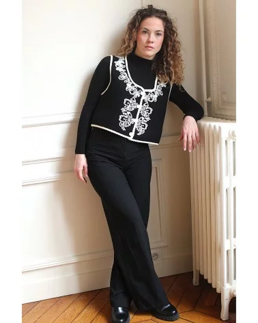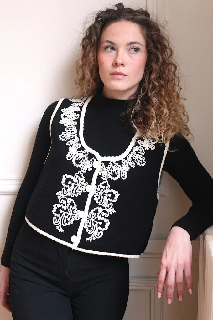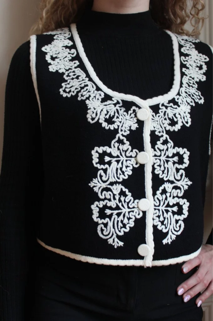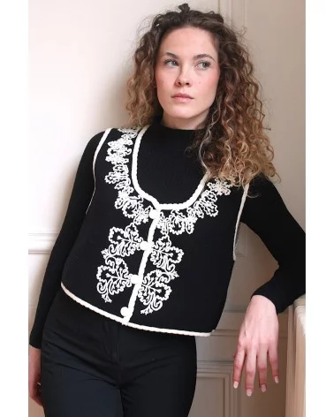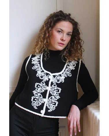 Ajoutez une touche de sophistication à votre tenue avec notre Gilet Pepy à manches courtes, magnifiquement orné de broderies blanches délicates.