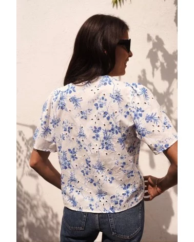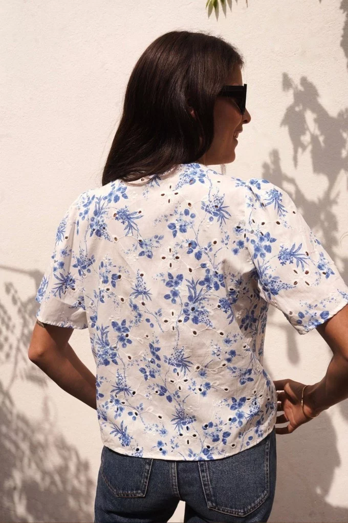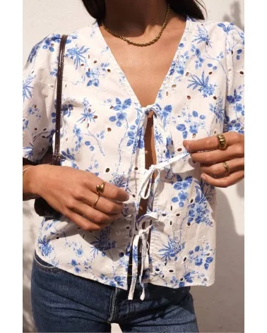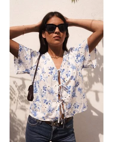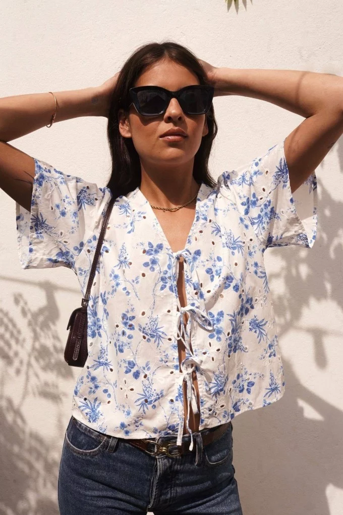 En blanc lumineux orné de motifs de fleurs bleues délicates, il séduit par sa coupe légère et son détail signature : de jolis nœuds à nouer sur le devant, qui ajoutent une touche romantique et ajustable. Facile à porter, aussi bien avec un short en jean qu’une jupe fluide.
