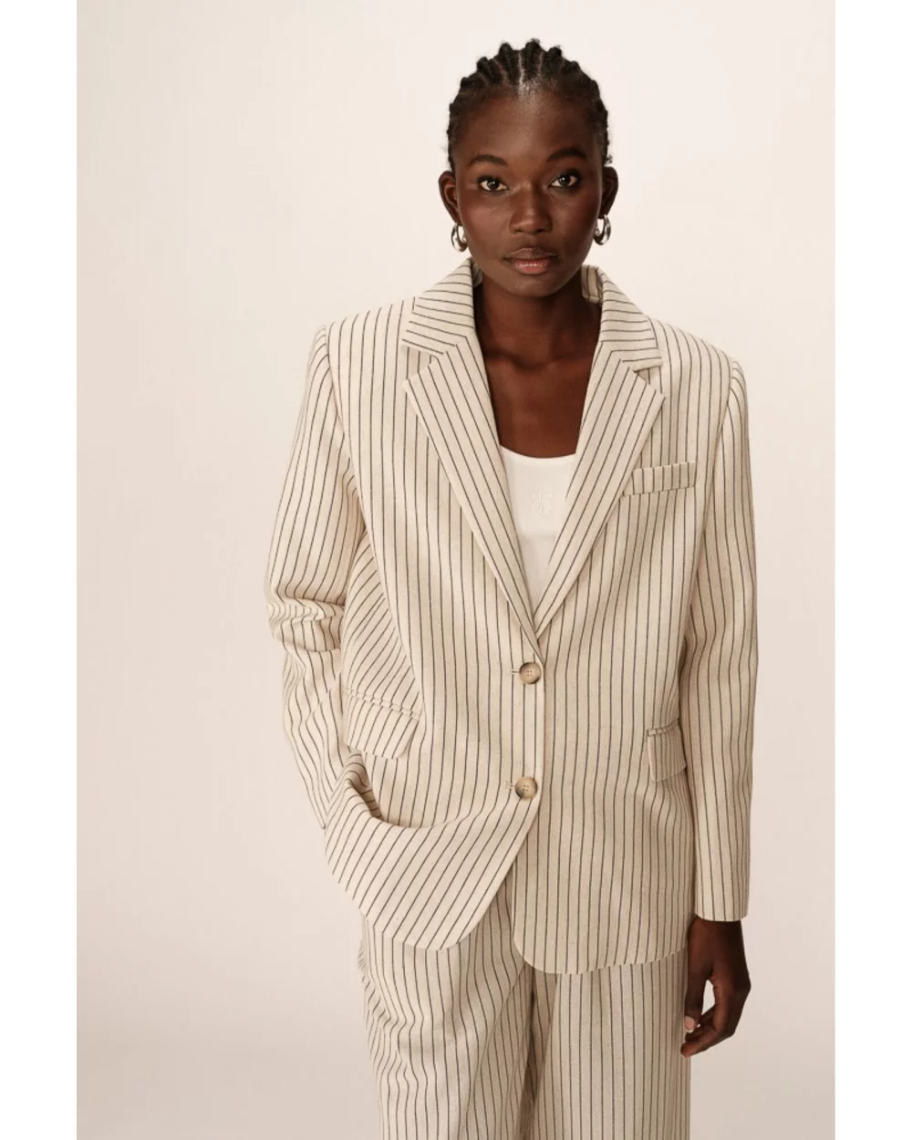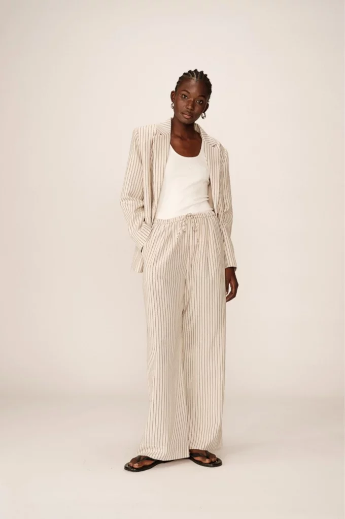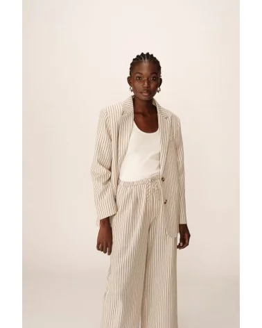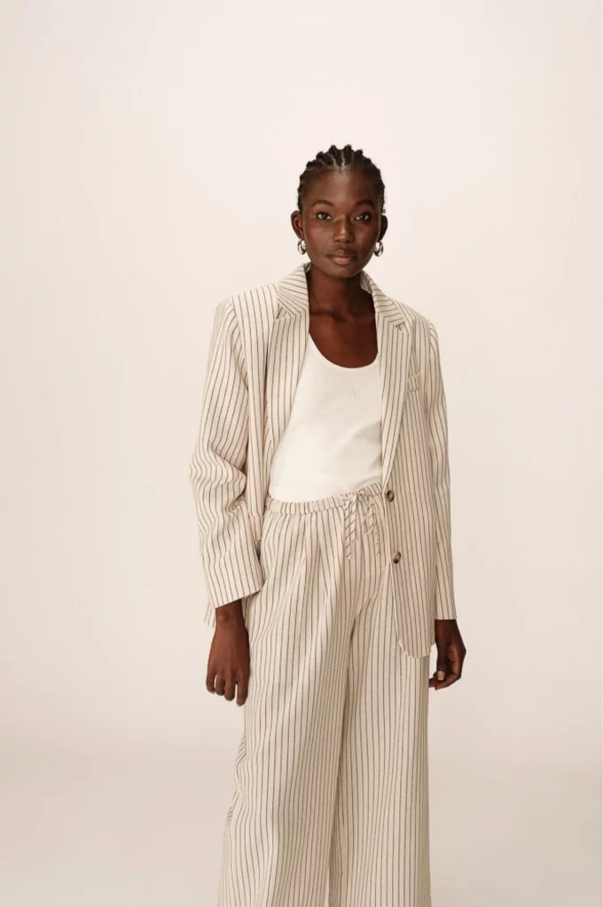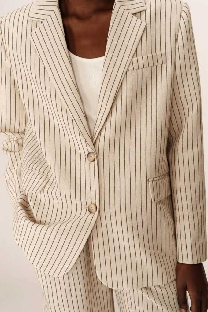La veste PIA est une veste tailleur rayée au style affirmé. Avec ses manches longues, son col à revers et son encolure en V, elle offre une allure élégante sans en faire trop. Sa coupe décontractée et son tissu en fibres naturelles assurent confort et modernité au quotidien. À porter en total look tailleur ou à mixer avec un jean pour une touche plus casual.